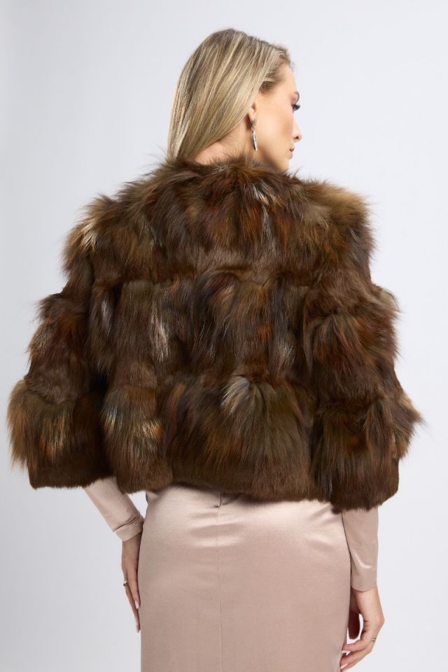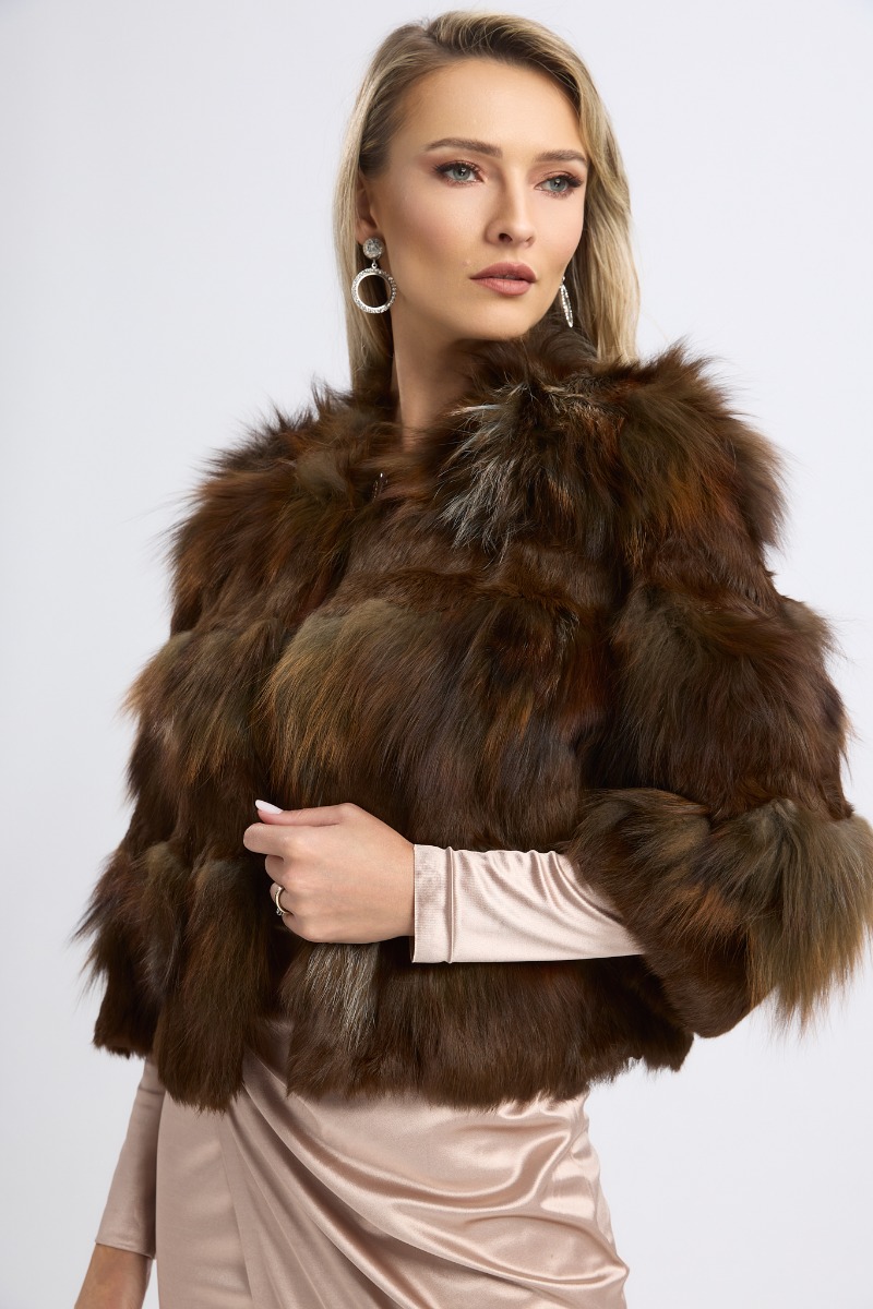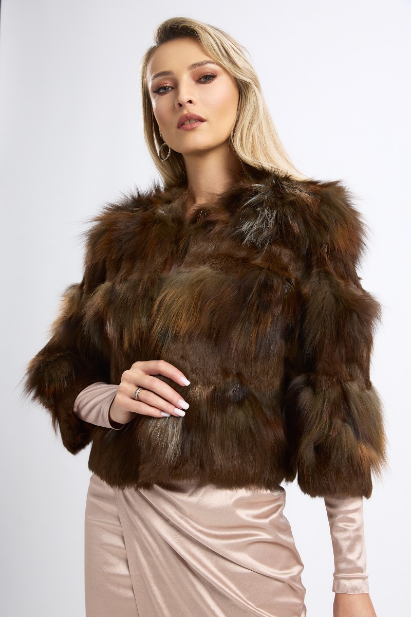 Descoperă rafinamentul suprem cu această jachetă scurtă din blană naturală maro de vulpe, o piesă exclusivistă ce îmbină luxul autentic cu un design modern și spectaculos.