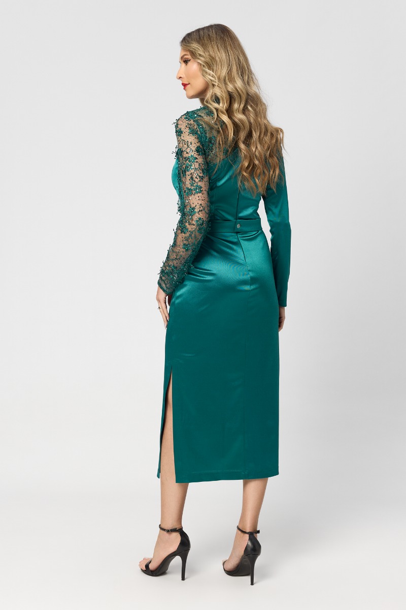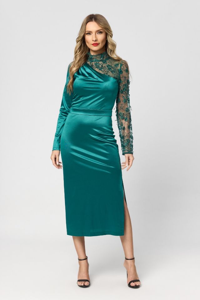 Rochie de ocazie din satin cu decolteu si maneca din dantela Carina Verde