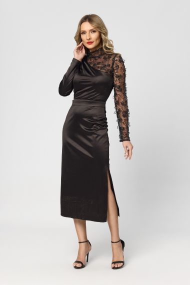 O rochie de ocazie midi din satin verde, cu decolteu și o mânecă din dantelă, este alegerea perfectă pentru un look elegant și sofisticat, cu accente moderne și feminine. Satinul oferă un aspect fin și luxos, evidențiind delicat silueta prin luciul său discret, în timp ce croiul midi aduce echilibru între rafinament și confort.