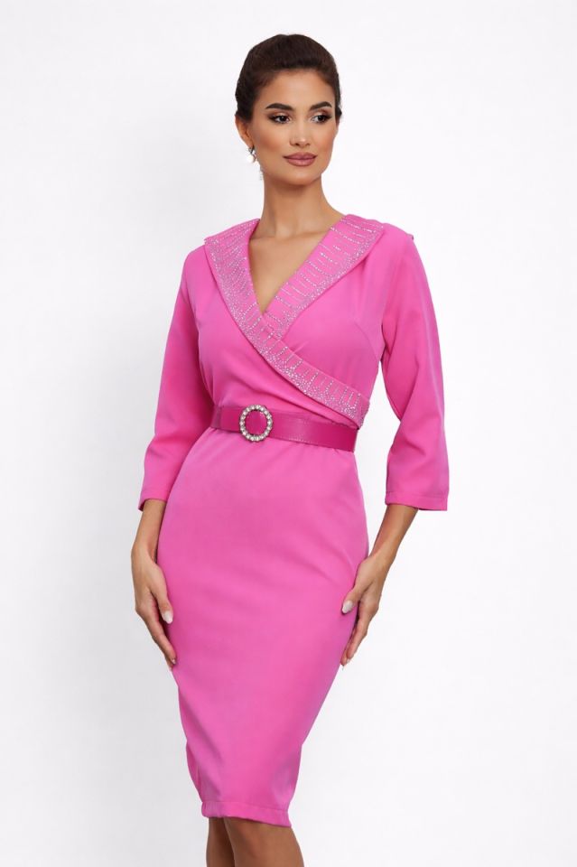 Rochie eleganta ciclam, cu lungime medie, accesorizata cu strass-uri in partea superioara, se potriveste perfect evenimentelor elegante unde vrei sa te evidentiezi printr-o tinuta chic.
