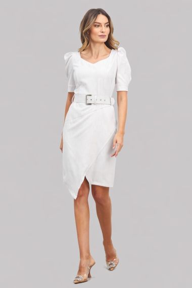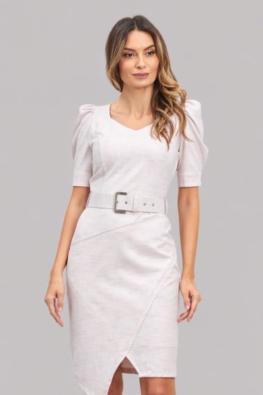 Rochie bej eleganta ce este o alegere vestimentara ideala pentru o tinuta office cu stil.