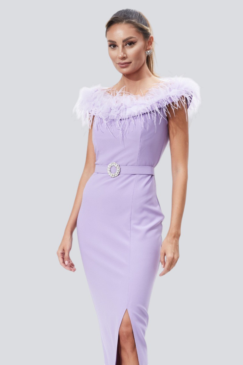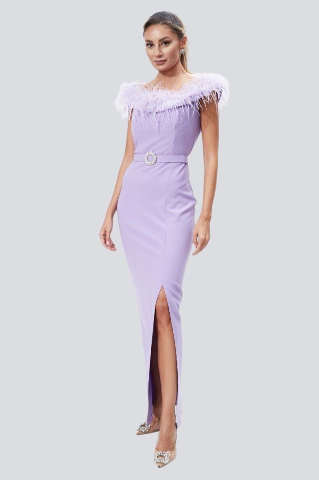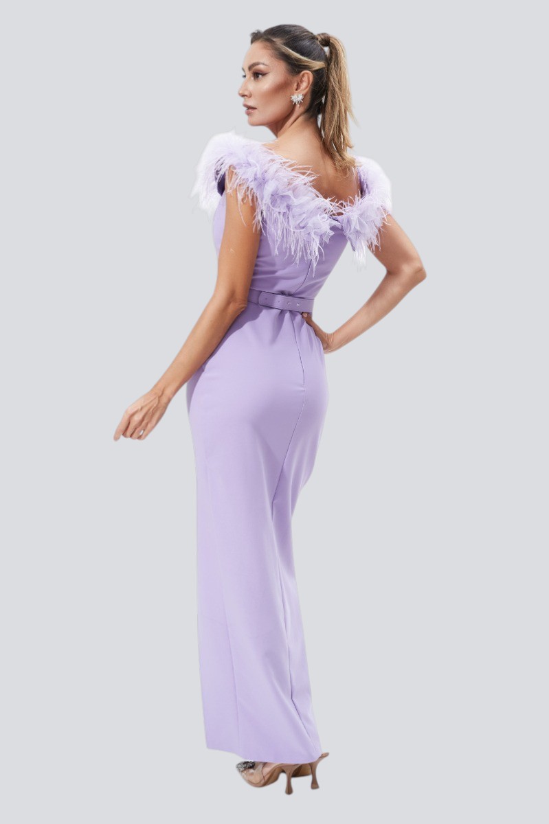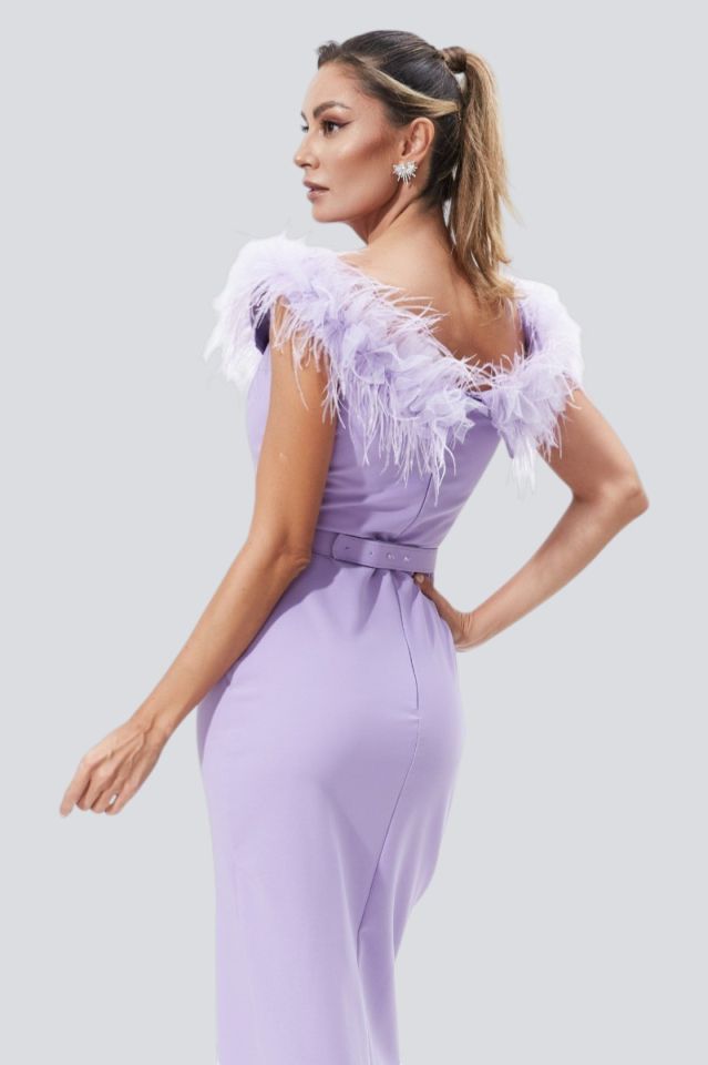 Rochie eleganta lunga lila cu pene si tull la decolteu, crepeu in fata este perfecta pentru o tinuta cu stil. Modelul versatil se potriveste atat unei tinute de zi, dar si unei tinute de seara datorita design-ului deosebit. Trebuie sa ai aceasta rochie deosebita in garderoba ta.