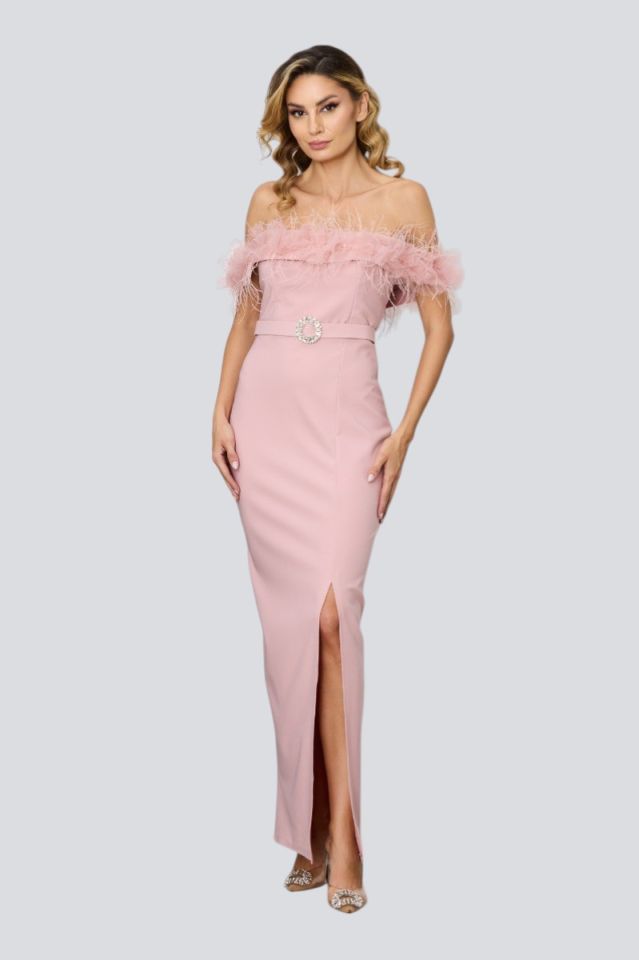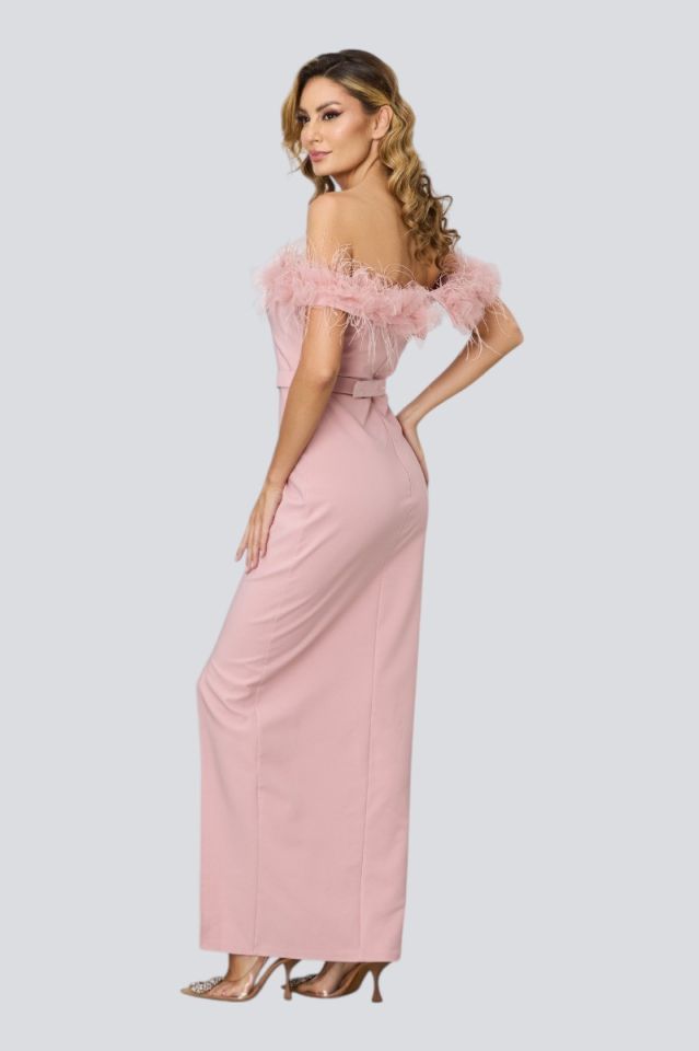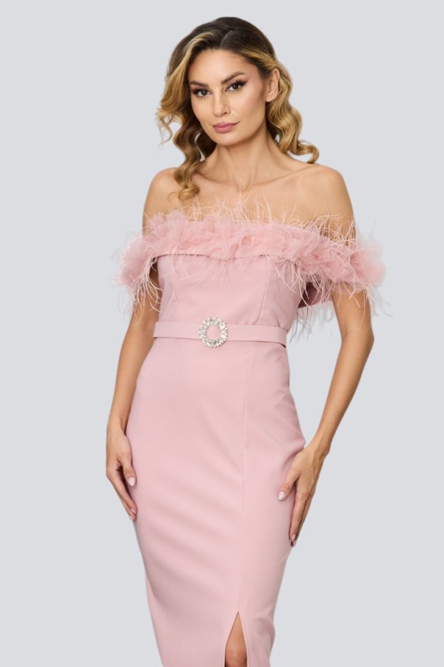Rochie eleganta lunga rose cu pene si tull la decolteu, crepeu in fata este perfecta pentru o tinuta cu stil. Modelul versatil se potriveste atat unei tinute de zi, dar si unei tinute de seara datorita design-ului deosebit. Trebuie sa ai aceasta rochie deosebita in garderoba ta.