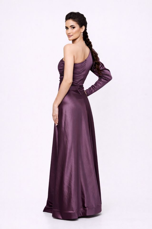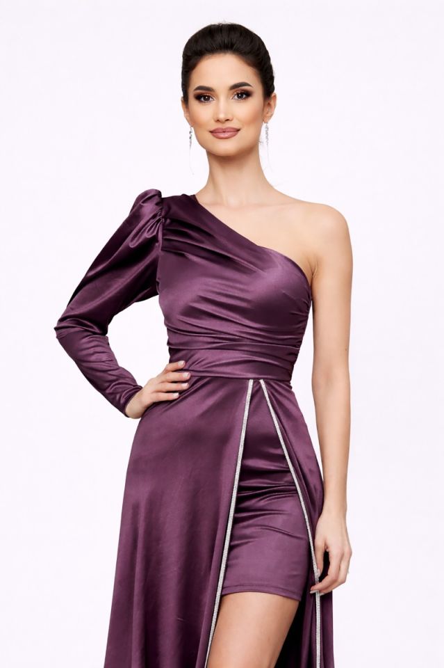 Rochie lunga de ocazie din satin, mov, accesorizata cu strass-uri, perfecta pentru evenimentele importante la care doresti sa ai o aparitie de invidiat. Croiul sau iti contureaza silueta si iti confera suplete si sex-appeal.