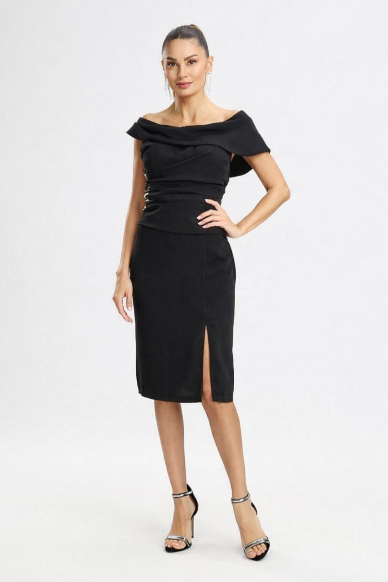 Rochie midi de ocazie neagra, cu un design seducător și elegant. Accesorizată cu strass-uri strălucitoare și crepeu frontal, pune în valoare feminitatea și rafinamentul fiecărui pas. Perfectă pentru petreceri și evenimente speciale.