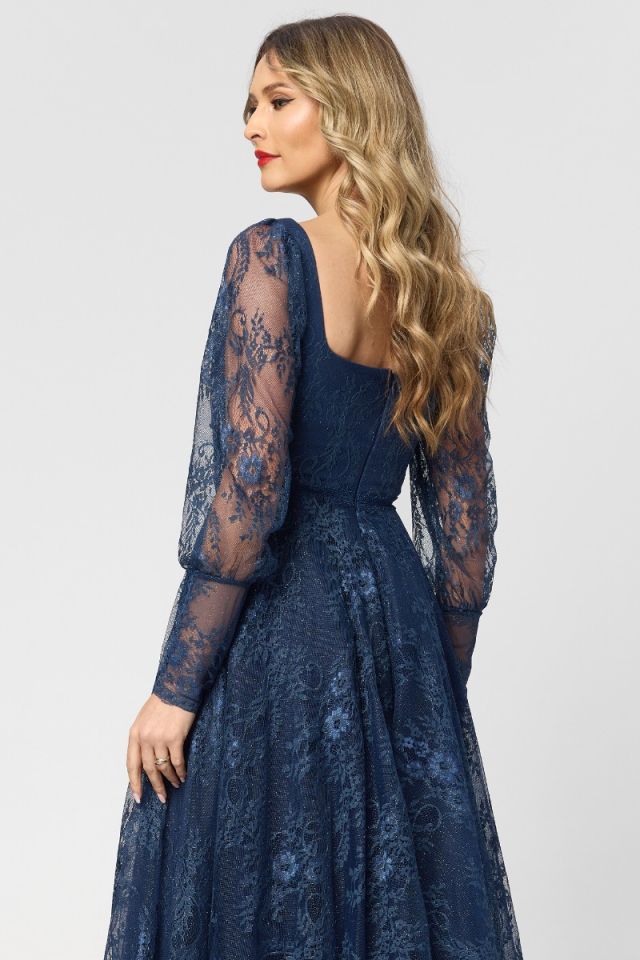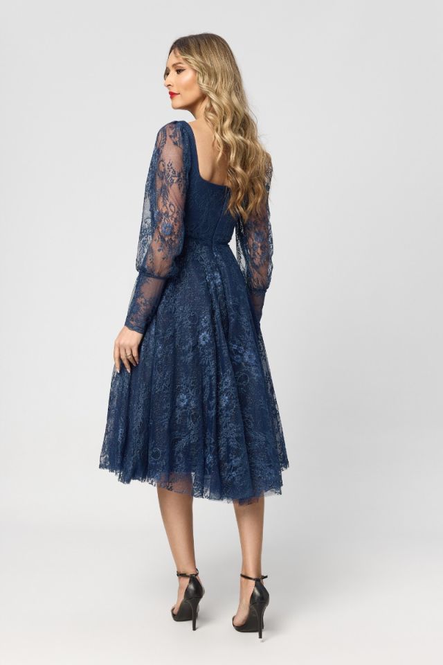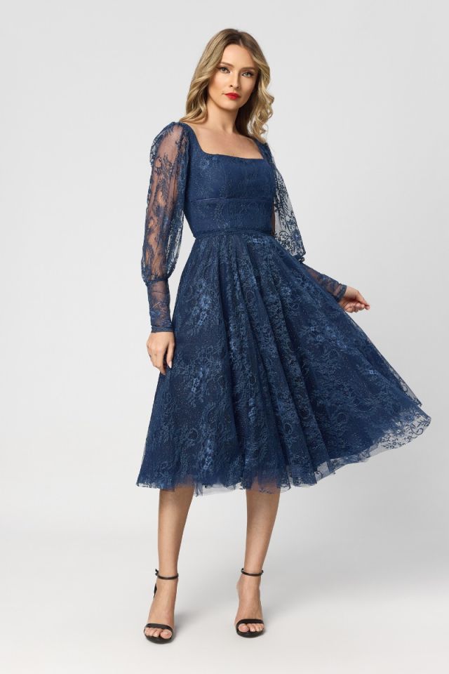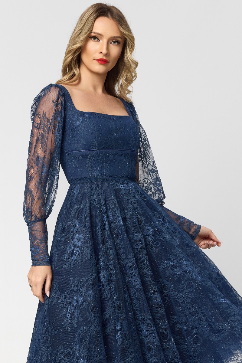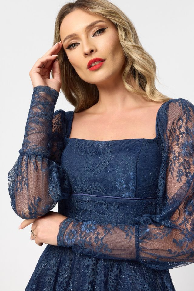 O rochie midi de ocazie bleumarin din dantelă care emană eleganță și rafinament prin fiecare detaliu. Textura delicată a dantele evidențiază modelul fin al materialului și conturează armonios silueta.