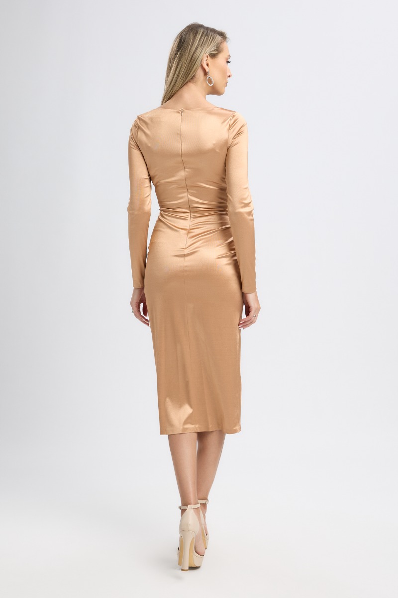 Descoperă eleganța care îmbracă silueta în cele mai fine linii. Această rochie de ocazie midi intr-o nuanta de nude, cu croi petrecut, este realizată din licra satinat pentru un efect fluid, lucios și sofisticat. Materialul cade impecabil, evidențiind formele și oferind libertate de mișcare, în timp ce designul petrecut conturează talia și creează o siluetă suplă și feminină.