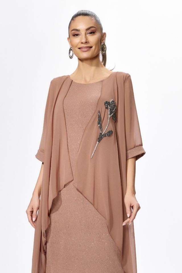 Rochie de ocazie din licra cu fir lame si aplicatie din strass-uri tip floare, reprezinta tinuta perfecta pentru evenimentele cu stil din acest sezon. Realizata dintr-un material elegant si un design delicat, confera tinutei tale un rafinament aparte.