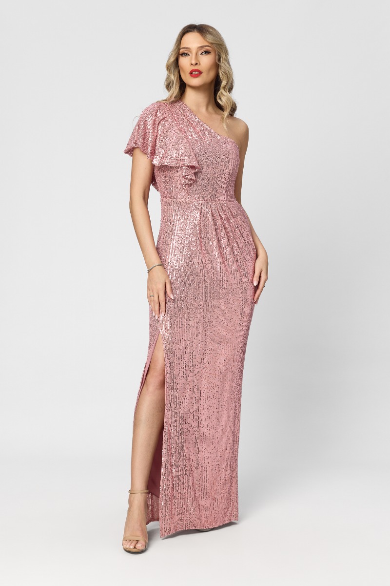 O rochie lungă de ocazie din paiete rose este alegerea ideală pentru apariții spectaculoase, în care strălucirea și eleganța se îmbină perfect. Acest tip de rochie este creat pentru a atrage toate privirile, datorită texturii bogate și efectului luminos oferit de paiete, care reflectă subtil lumina la fiecare mișcare.