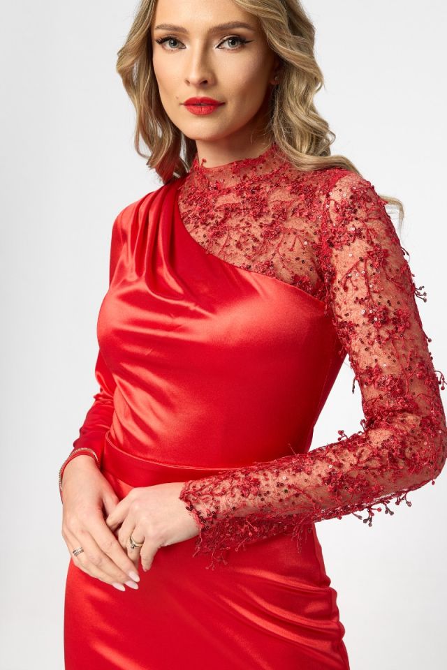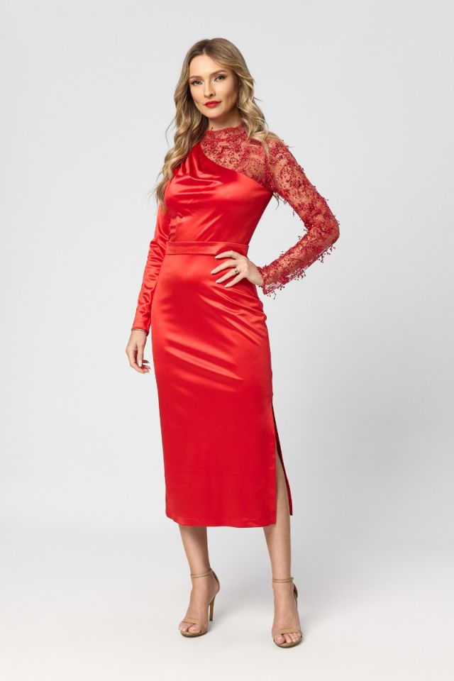 Rochie de ocazie din satin cu decolteu si maneca din dantela Carina Rosie
