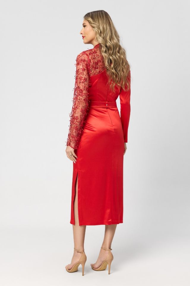 O rochie de ocazie rosie, midi din satin, cu decolteu și o mânecă din dantelă, este alegerea perfectă pentru un look elegant și sofisticat, cu accente moderne și feminine. Satinul oferă un aspect fin și luxos, evidențiind delicat silueta prin luciul său discret, în timp ce croiul midi aduce echilibru între rafinament și confort.
