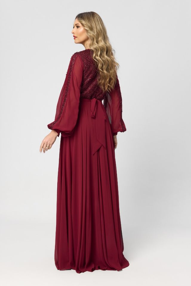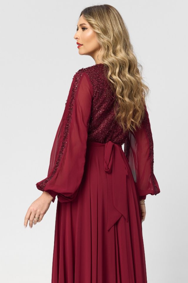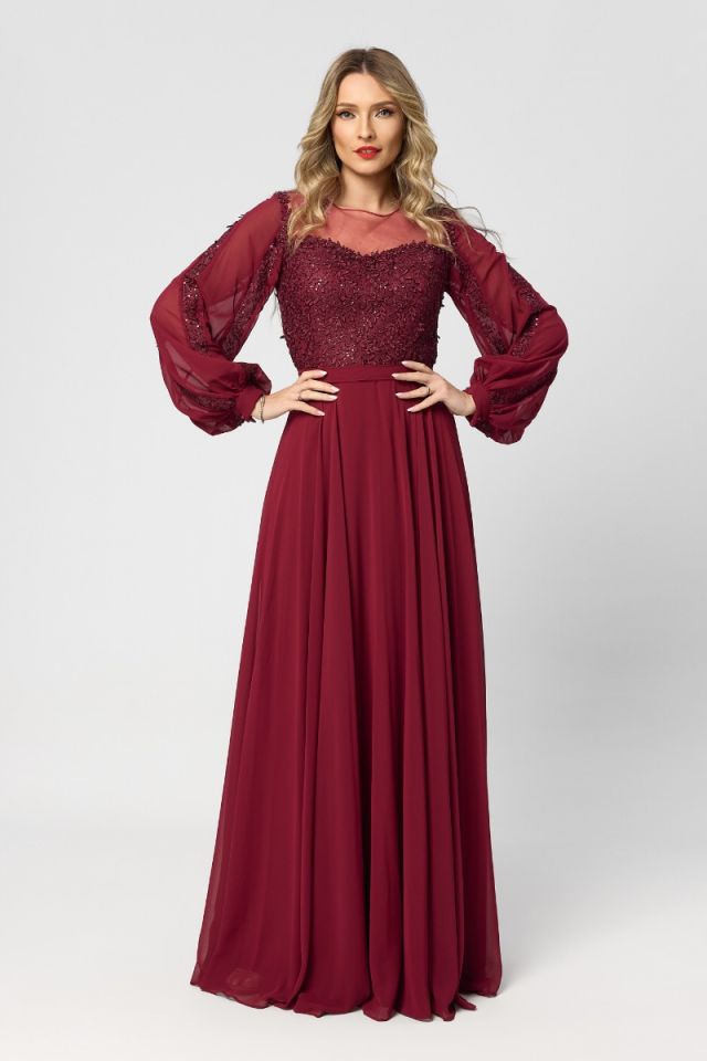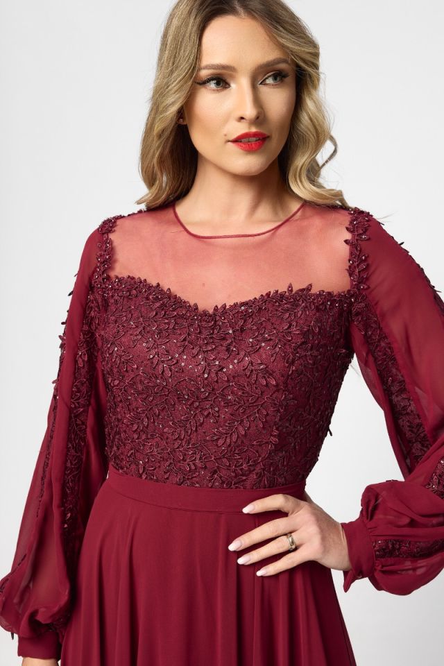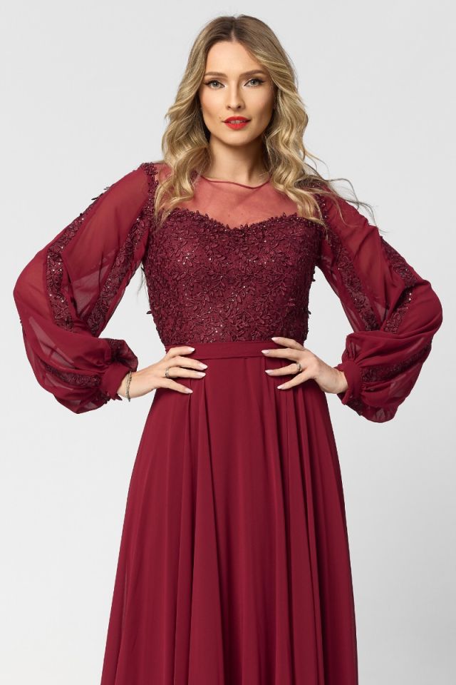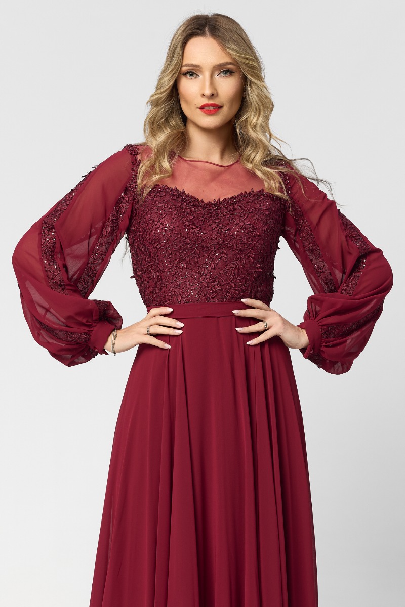 O rochie lungă de ocazie din voal cu dantelă în nuanță de bordo este alegerea perfectă pentru apariții elegante și pline de rafinament. Croiul in clos adaugă un aer regal și feminin, fiind ideală pentru evenimente speciale, de seară.