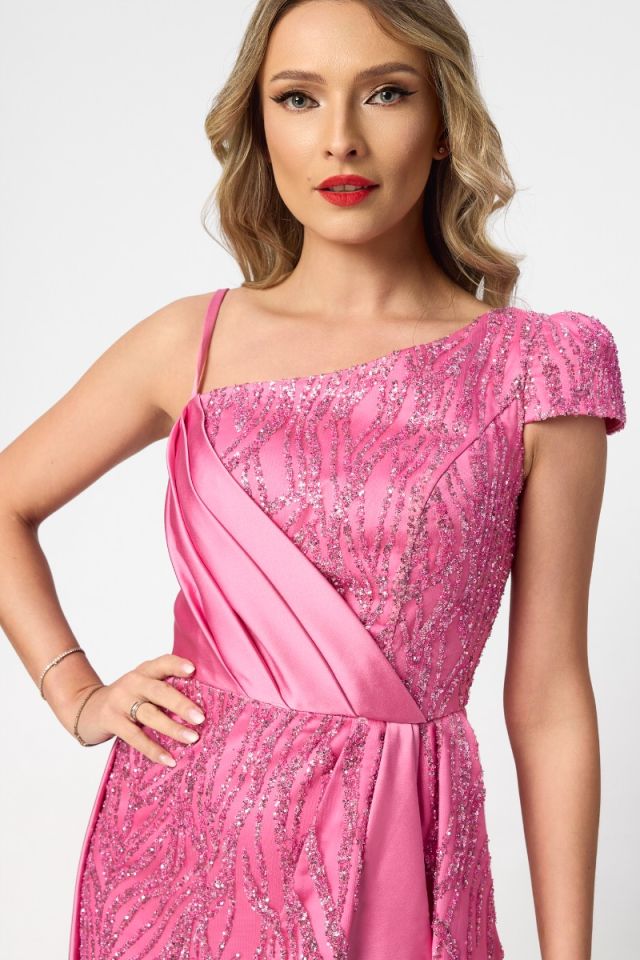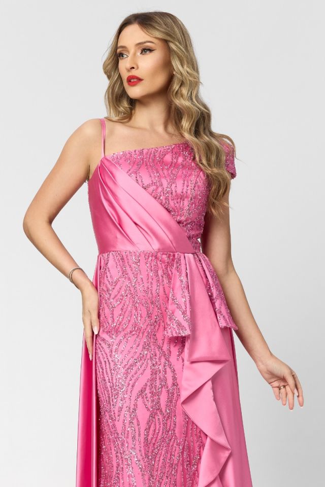 Rochie de ocazie premium tip one shoulder cu trena Romance Roz