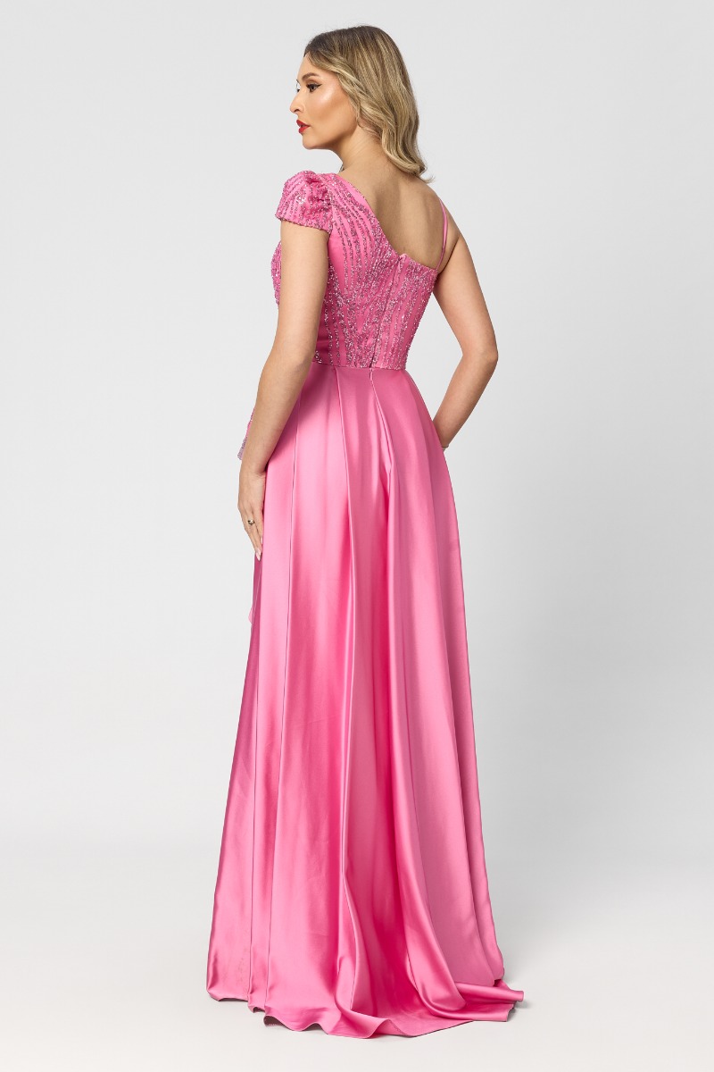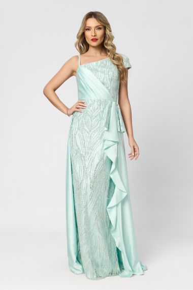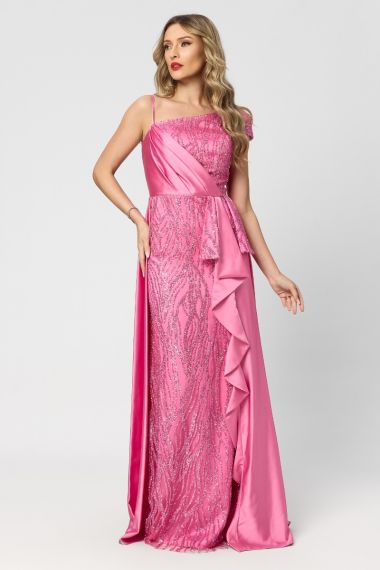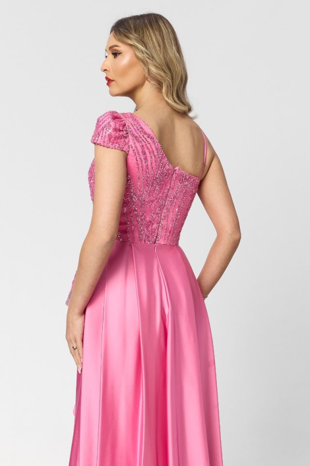 O rochie lungă roz tip one shoulder, cu trenă, din colecția de lux, este definiția eleganței absolute și a rafinamentului modern. Nuanța delicată de roz oferă un aer fresh și sofisticat, perfect pentru evenimente exclusiviste în care fiecare detaliu contează.