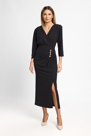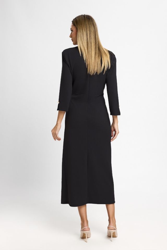 Rochie de ocazie midi neagra, accesorizata cu butoni aurii, special creata pentru evenimentele deosebite din viata ta. Aceasta rochie va scoate in evidenta frumusetea si delicatetea siluetei tale.