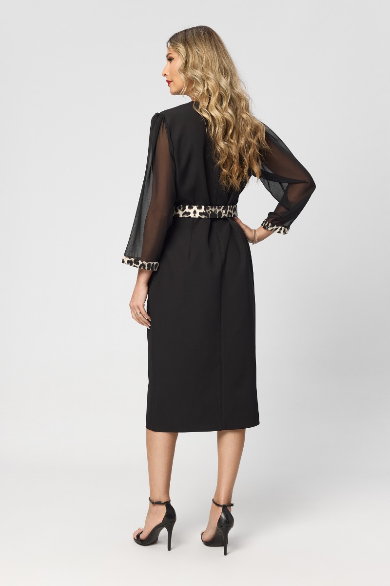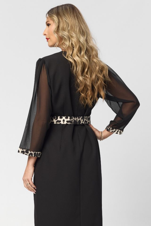 O rochie midi elegantă neagră cu detalii animal print combină rafinamentul clasic cu un strop de îndrăzneală modernă. Croiul petrecut avantajează silueta, evidențiind talia și oferind un efect feminin și sofisticat, în timp ce curea din talie completează armonios linia corpului.