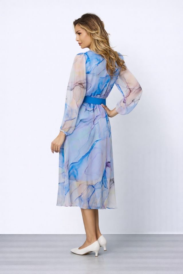 Rochie midi eleganta, din voal cu imprimeu albastru, perfecta atat pentru un eveniment de zi cat si pentru un eveniment de seara. Este o combinatie de clasic si modern perfecta atat pentru tinute office, tinute formale dar si elegante.
