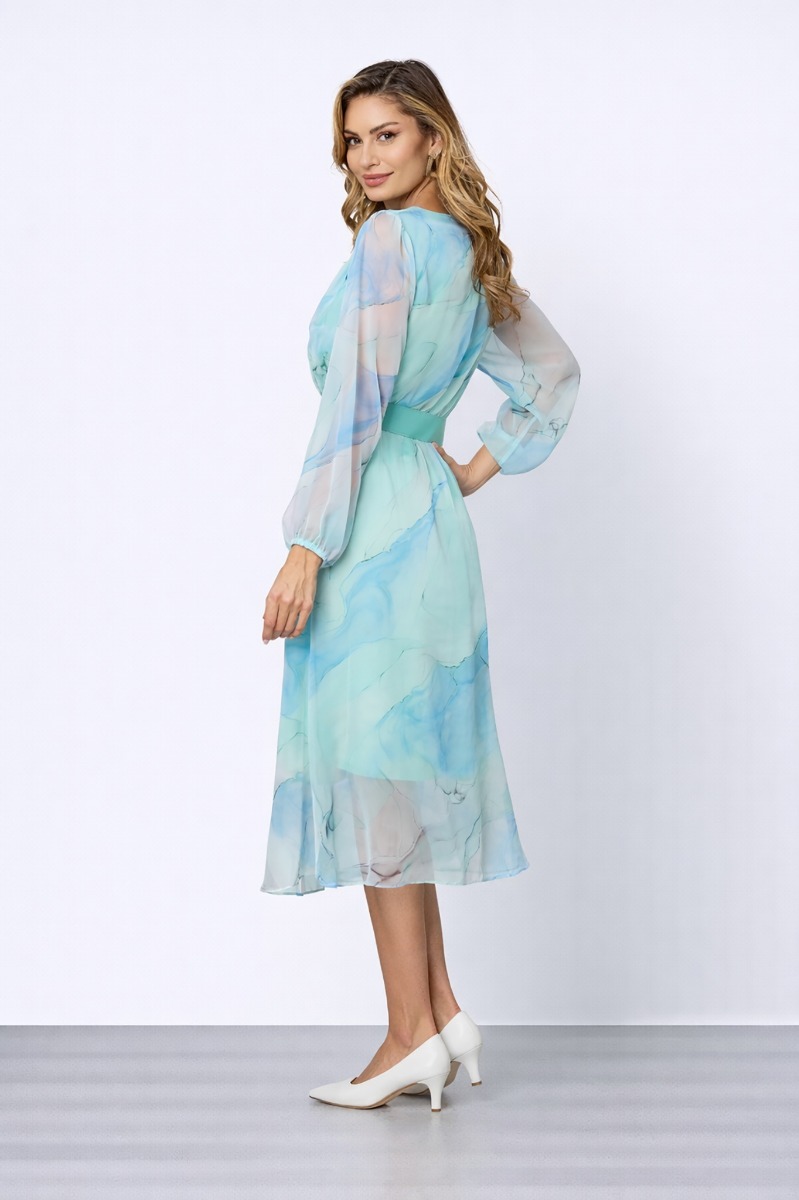 Rochie midi eleganta, din voal cu imprimeu bleu, perfecta atat pentru un eveniment de zi cat si pentru un eveniment de seara. Este o combinatie de clasic si modern perfecta atat pentru tinute office, tinute formale dar si elegante.