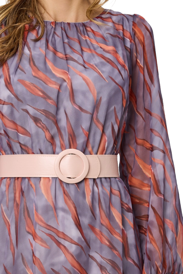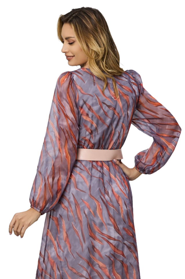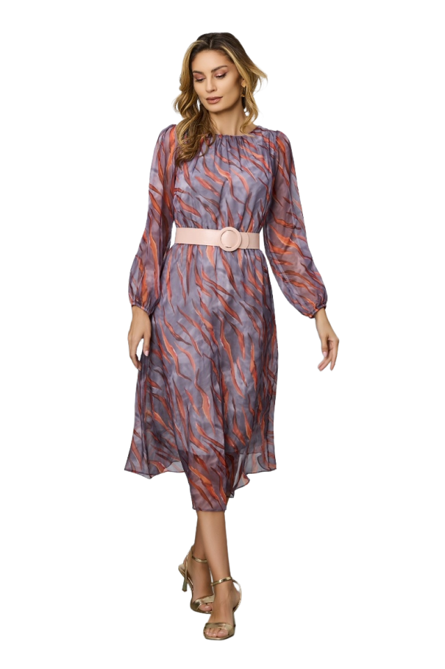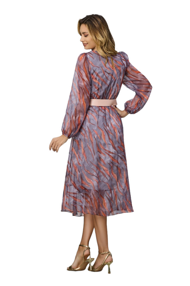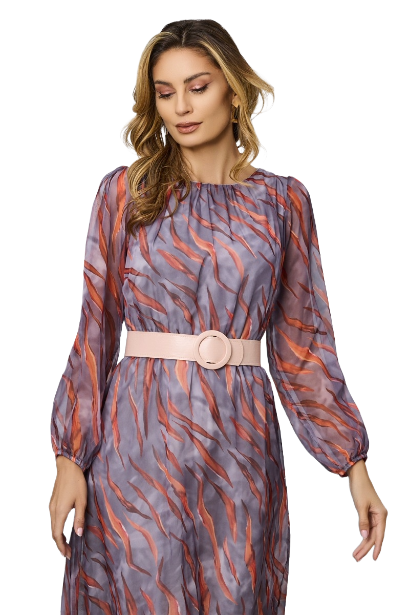 Rochie midi eleganta, din voal gri cu imprimeu orange, perfecta atat pentru un eveniment de zi cat si pentru un eveniment de seara. Este o combinatie de clasic si modern perfecta atat pentru tinute office, tinute formale dar si elegante.