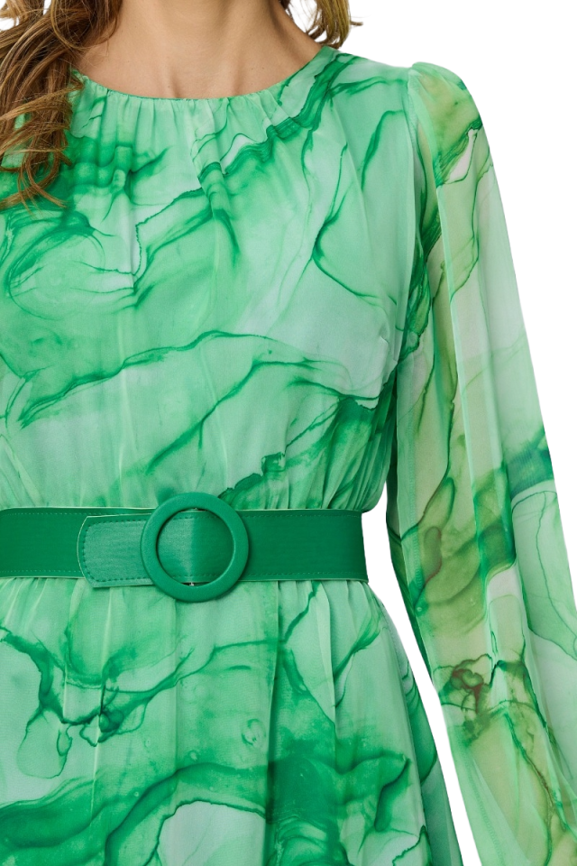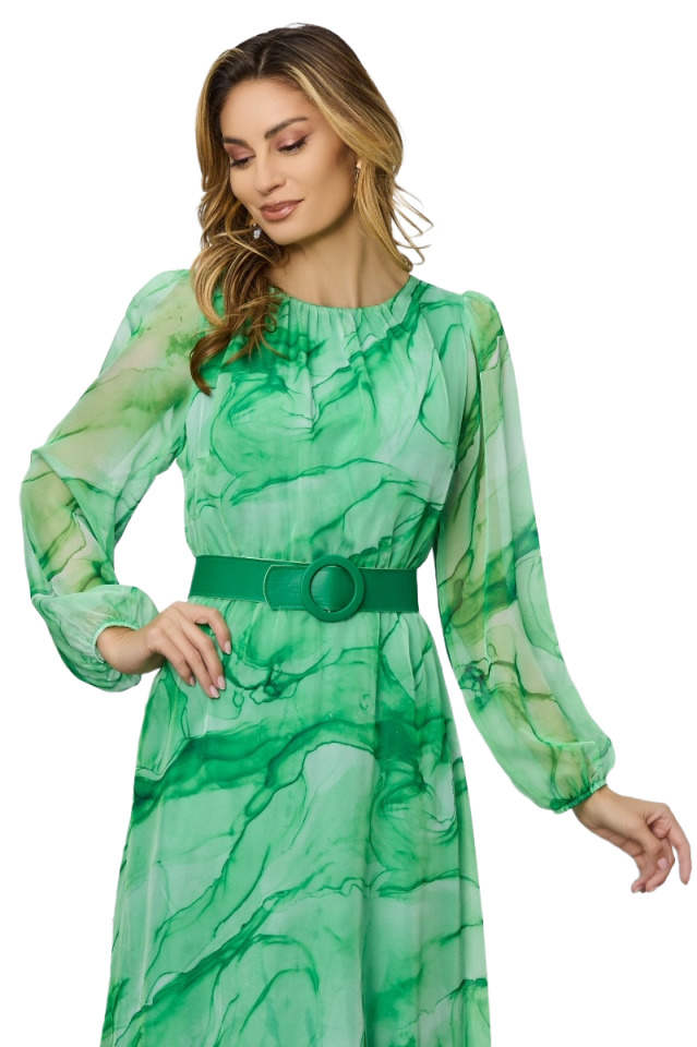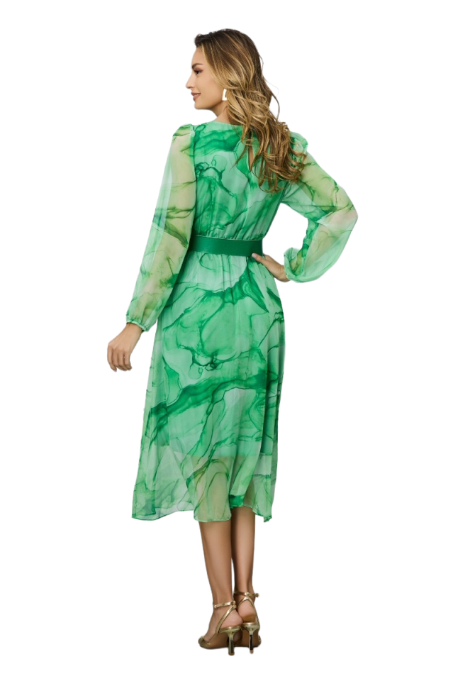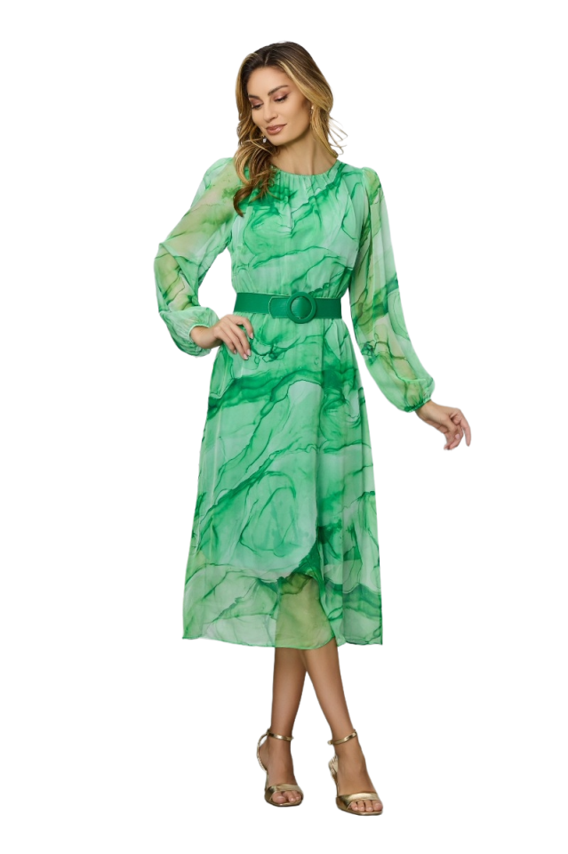 Rochie midi eleganta, din voal cu imprimeu verde, perfecta atat pentru un eveniment de zi cat si pentru un eveniment de seara. Este o combinatie de clasic si modern perfecta atat pentru tinute office, tinute formale dar si elegante.