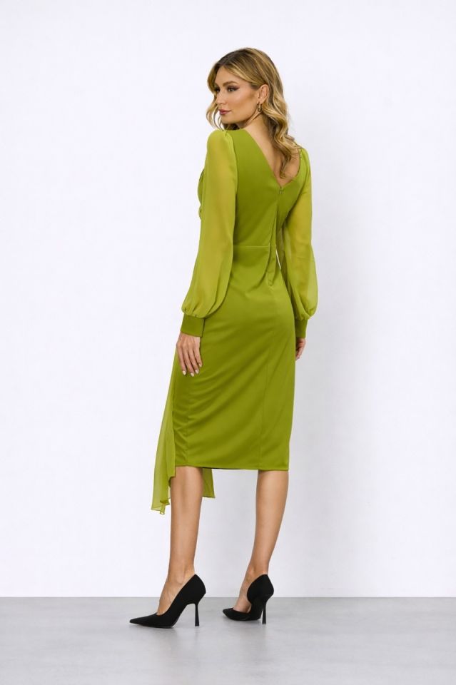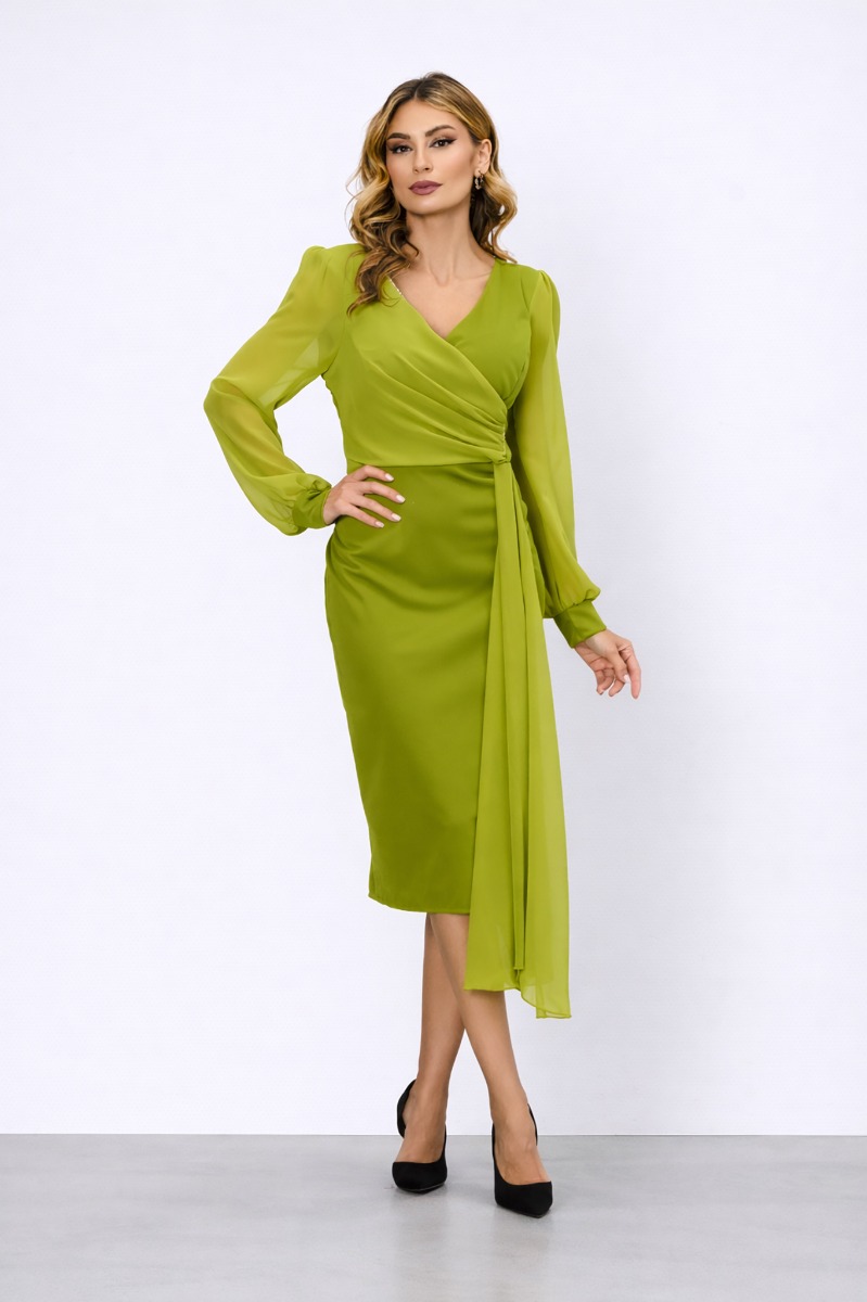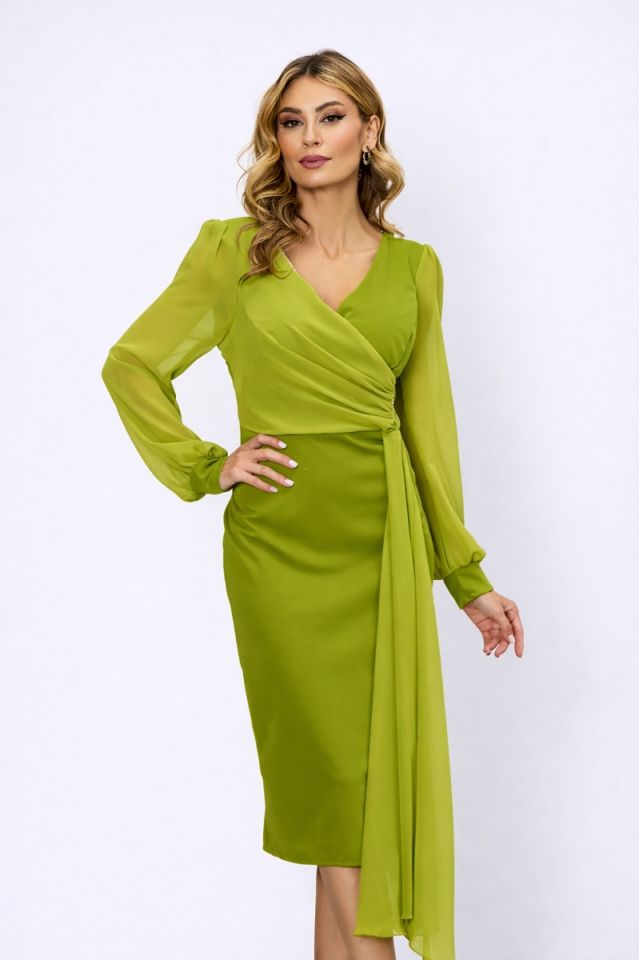 Rochie de ocazie midi fistic accesorizata cu strass-uri, ideala pentru o tinuta chic. Design-ul special, in trend iti ofera o prezenta deosebita.