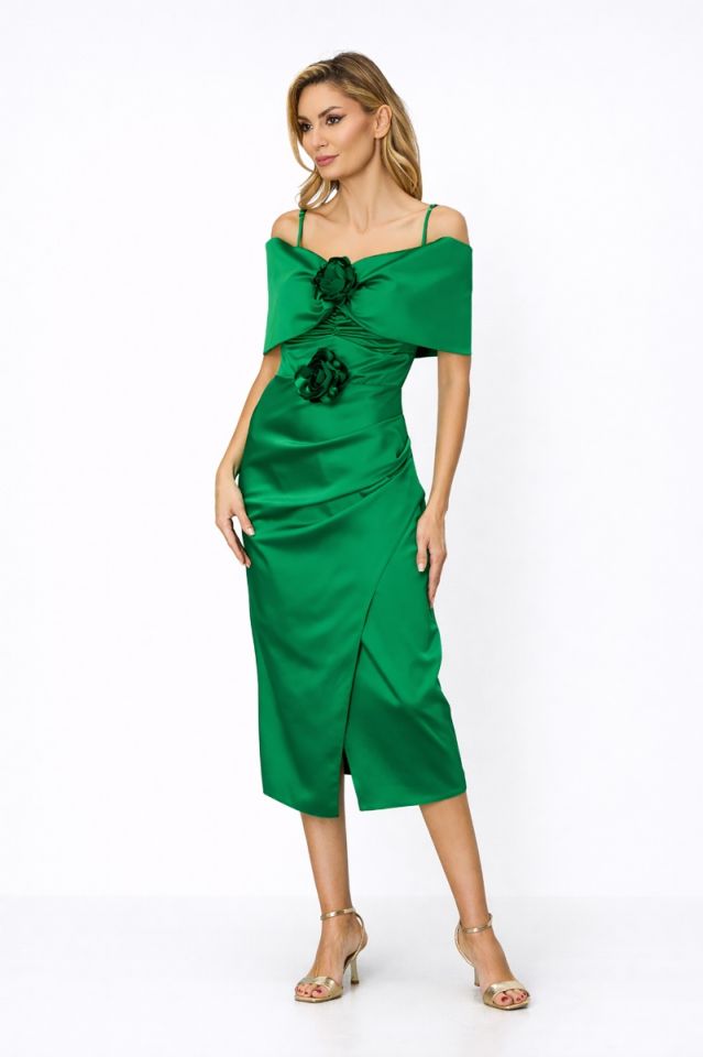 Rochie midi verde eleganta din satin cu flori 3D, ideala pentru o tinuta chic. Design-ul special, in trend iti ofera o prezenta deosebita.
