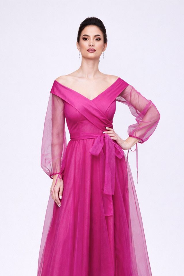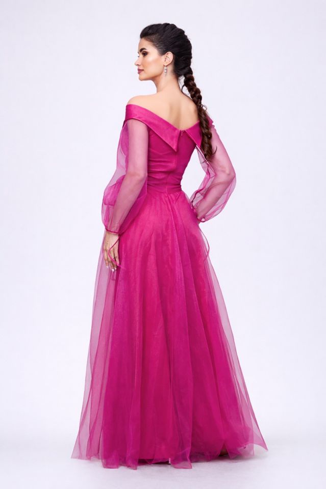 Impresioneaza la urmatorul tau eveniment cu o rochie lunga si vaporoasa, confectionata din tull fucsia pentru un plus de eleganta. Forma in clos precum si decolteul generos, vor face din aparitia ta, una spectaculoasa. Textura irezistibila iti asigura un look fermecator si rafinat.