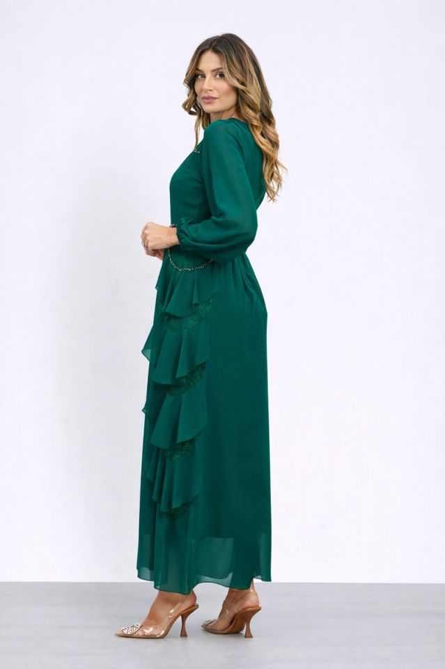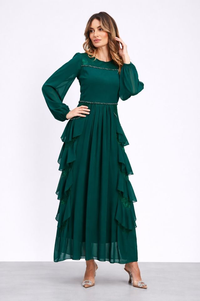 Rochia lunga verde din voal, foarte eleganta accesorizata cu strass-uri, dantela si volane se potriveste perfect petrecerilor unde vrei sa te evidentiezi. Modelul deosebit va face din aparitia ta, una fermecatoare.