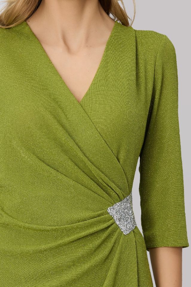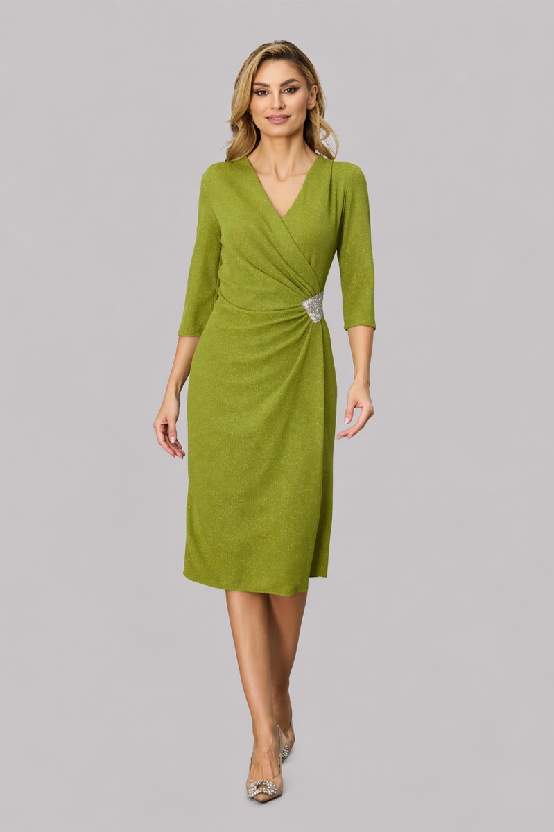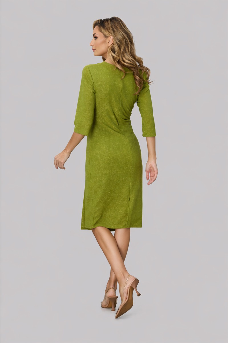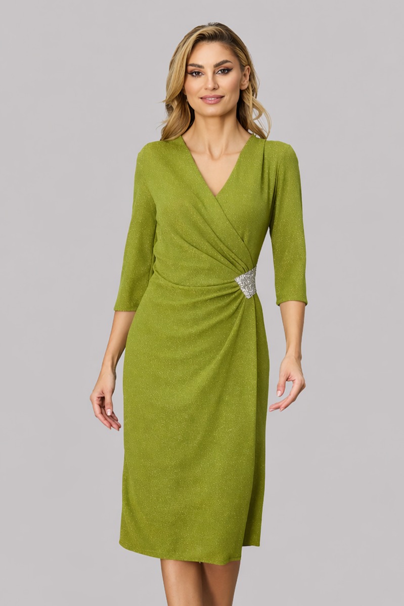 Rochie midi fistic eleganta din licra cu fir lame si strass-uri in talie, ideala pentru o tinuta chic. Design-ul special, in trend iti ofera o prezenta deosebita.