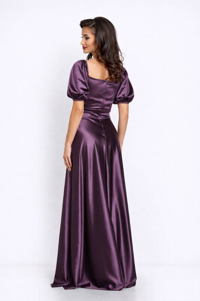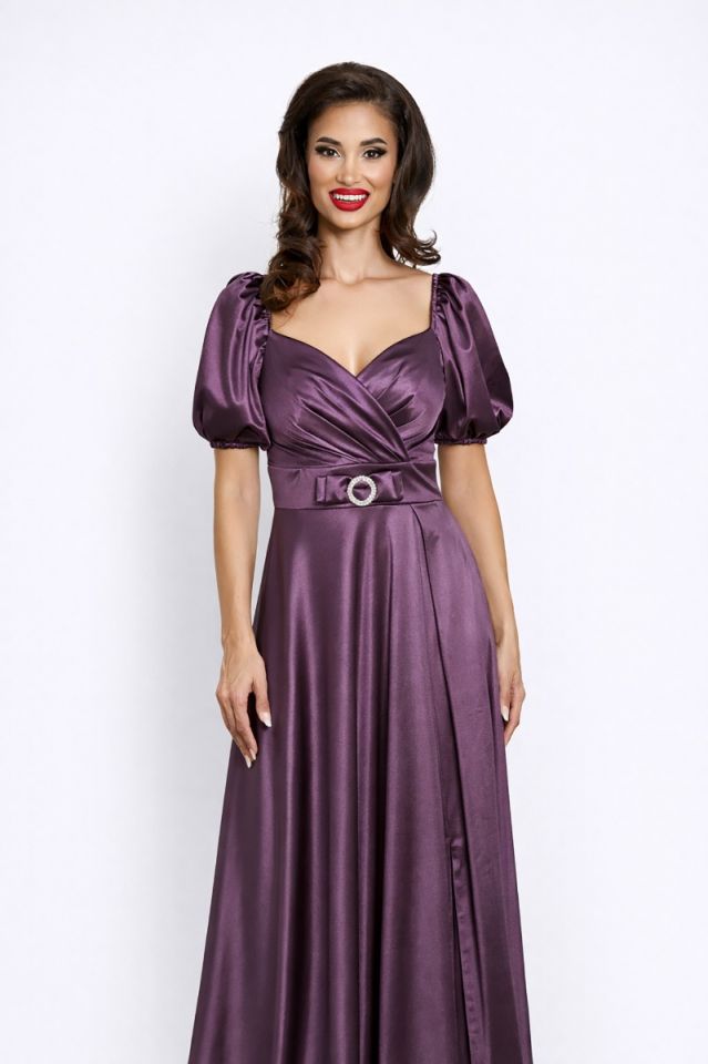 Impresioneaza la urmatorul tau eveniment imbracand o rochie lunga mov din licra satinat cu crepeu pentru un plus de eleganta. Forma in clos precum si decolteul generos, vor face din aparitia ta, una spectaculoasa.