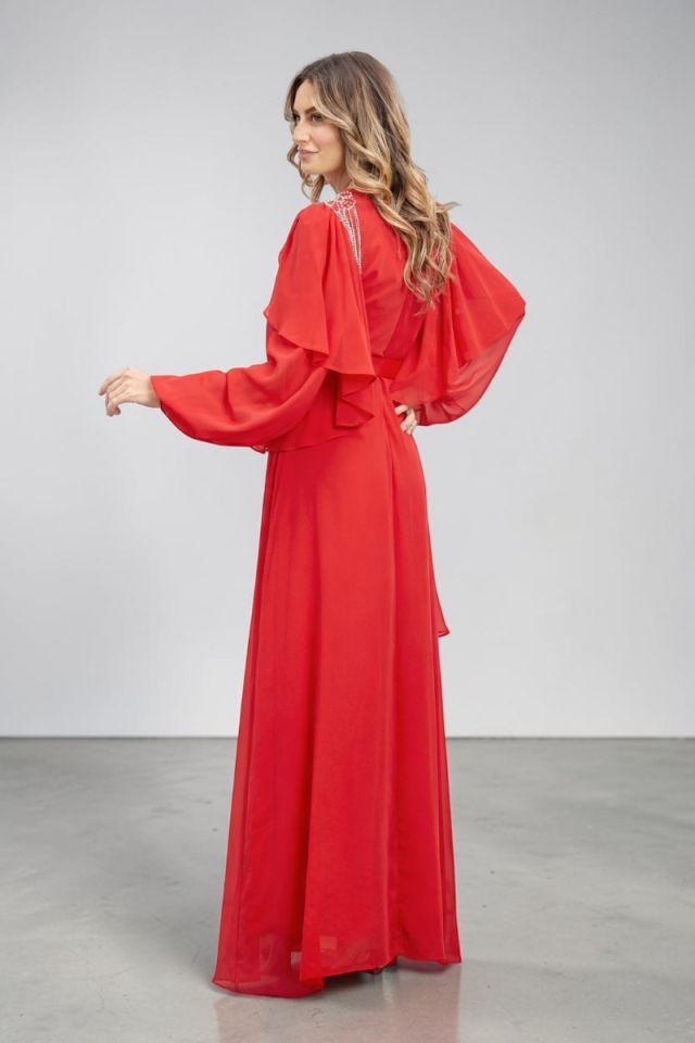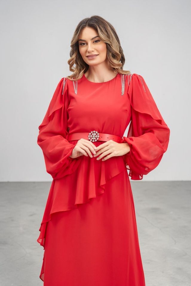 Rochia lunga rosie din voal, foarte eleganta accesorizata cu volan asimetric, ce se potriveste perfect petrecerilor unde vrei sa te evidentiezi. Modelul va face din aparitia ta, una fermecatoare.