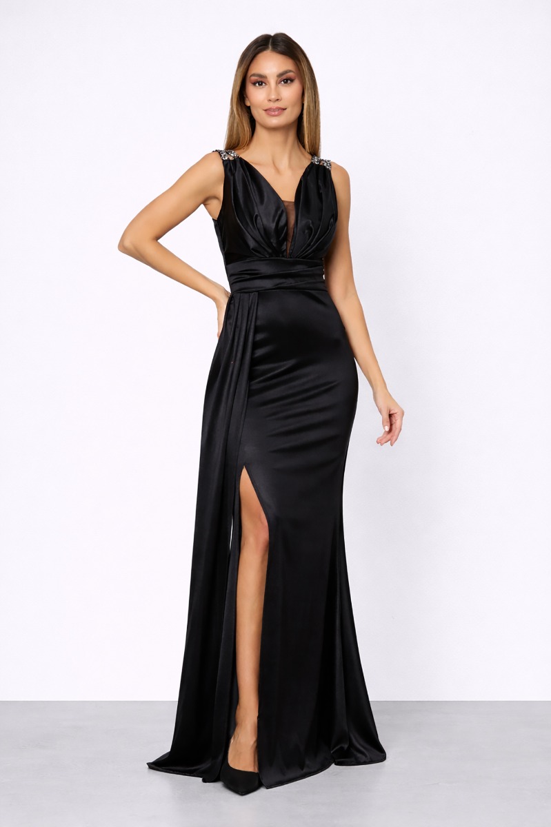 Rochie lunga de ocazie din licra satinata, accesorizata cu strass-uri, perfecta pentru evenimentele importante la care doresti sa ai o aparitie de invidiat. Croiul sau iti contureaza silueta si iti confera suplete si sex-appeal.