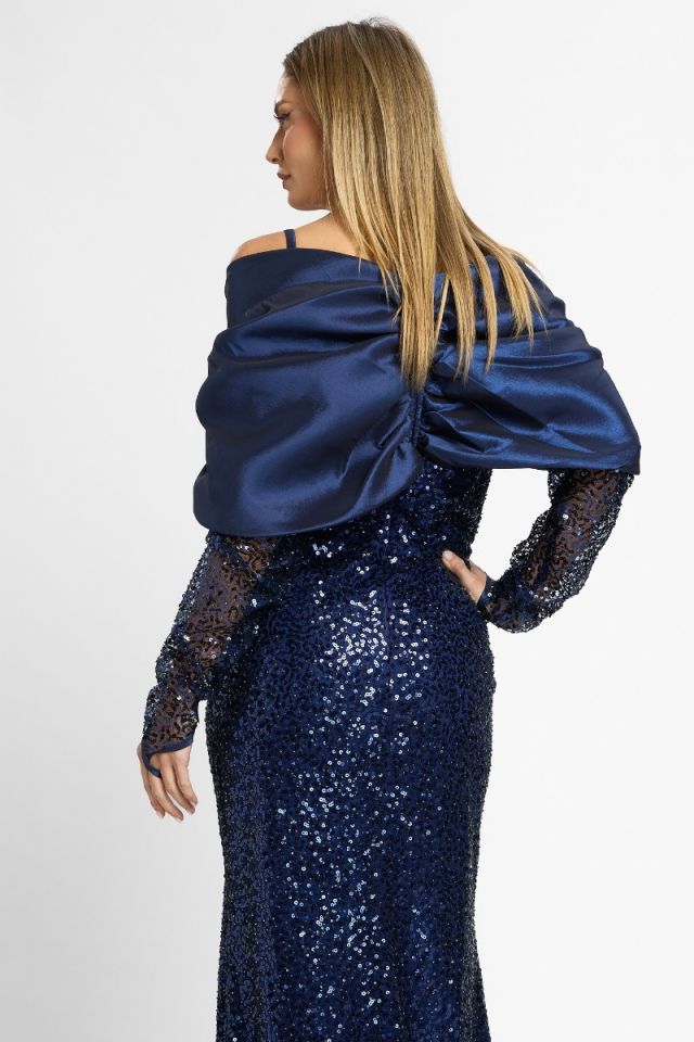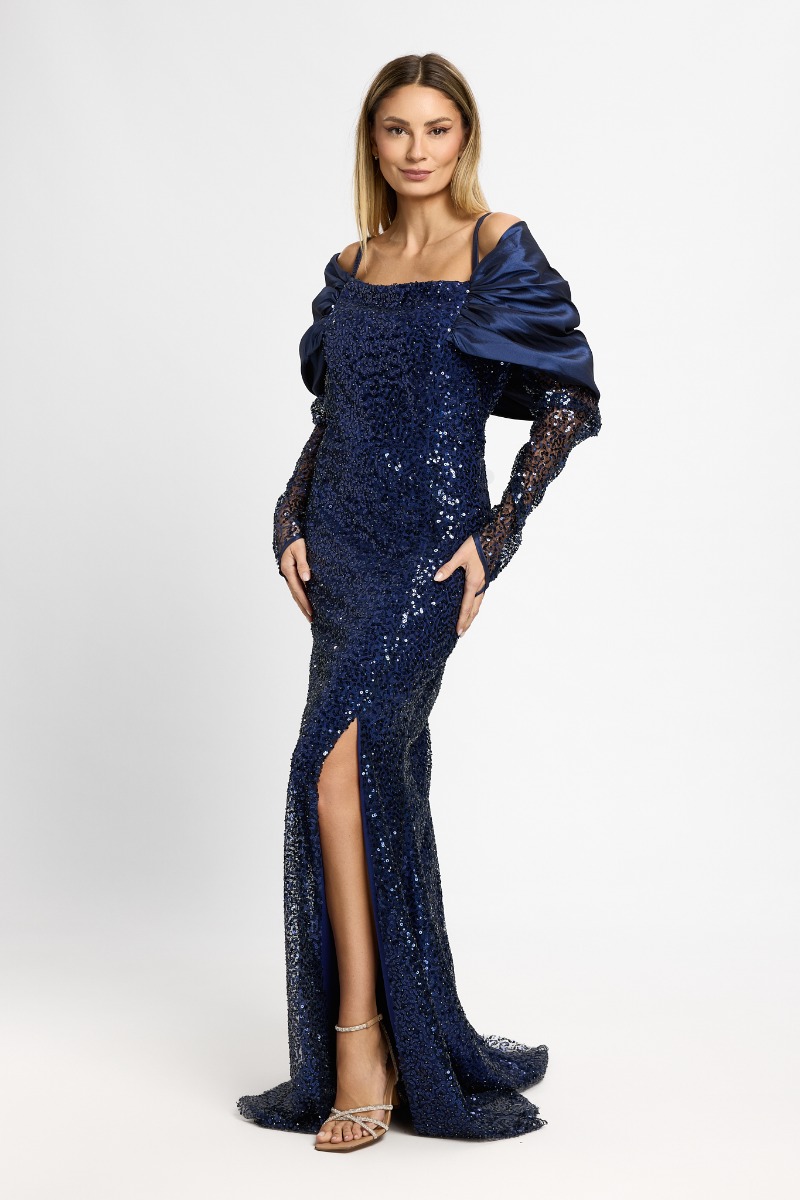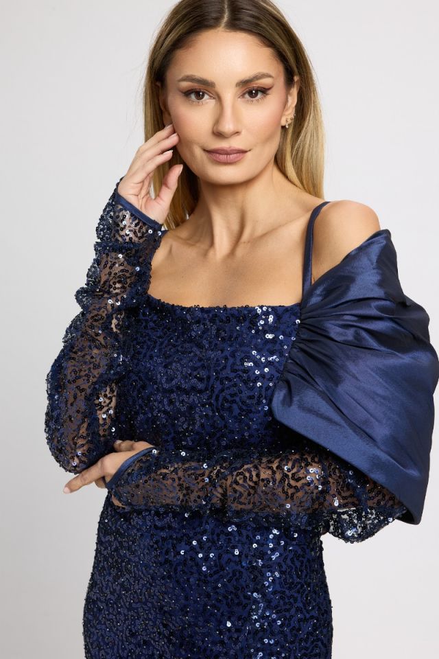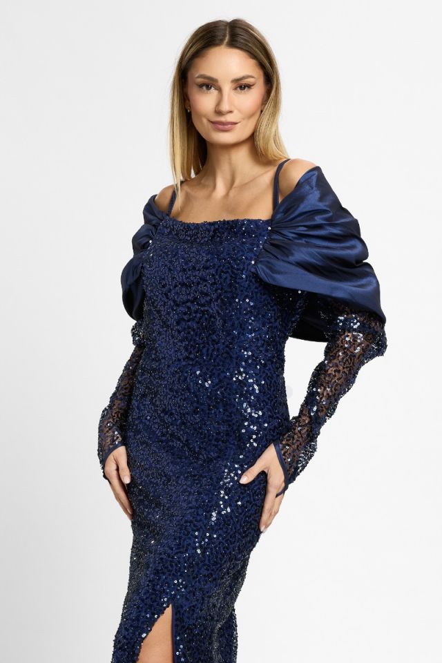 Rafinată și spectaculoasă, această rochie lungă de ocazie este creată pentru apariții memorabile. Realizată din material cu paiete strălucitoare, în nuanță sofisticată de bleumarin, rochia captează lumina la fiecare mișcare și oferă un aer glam, perfect pentru evenimente speciale.