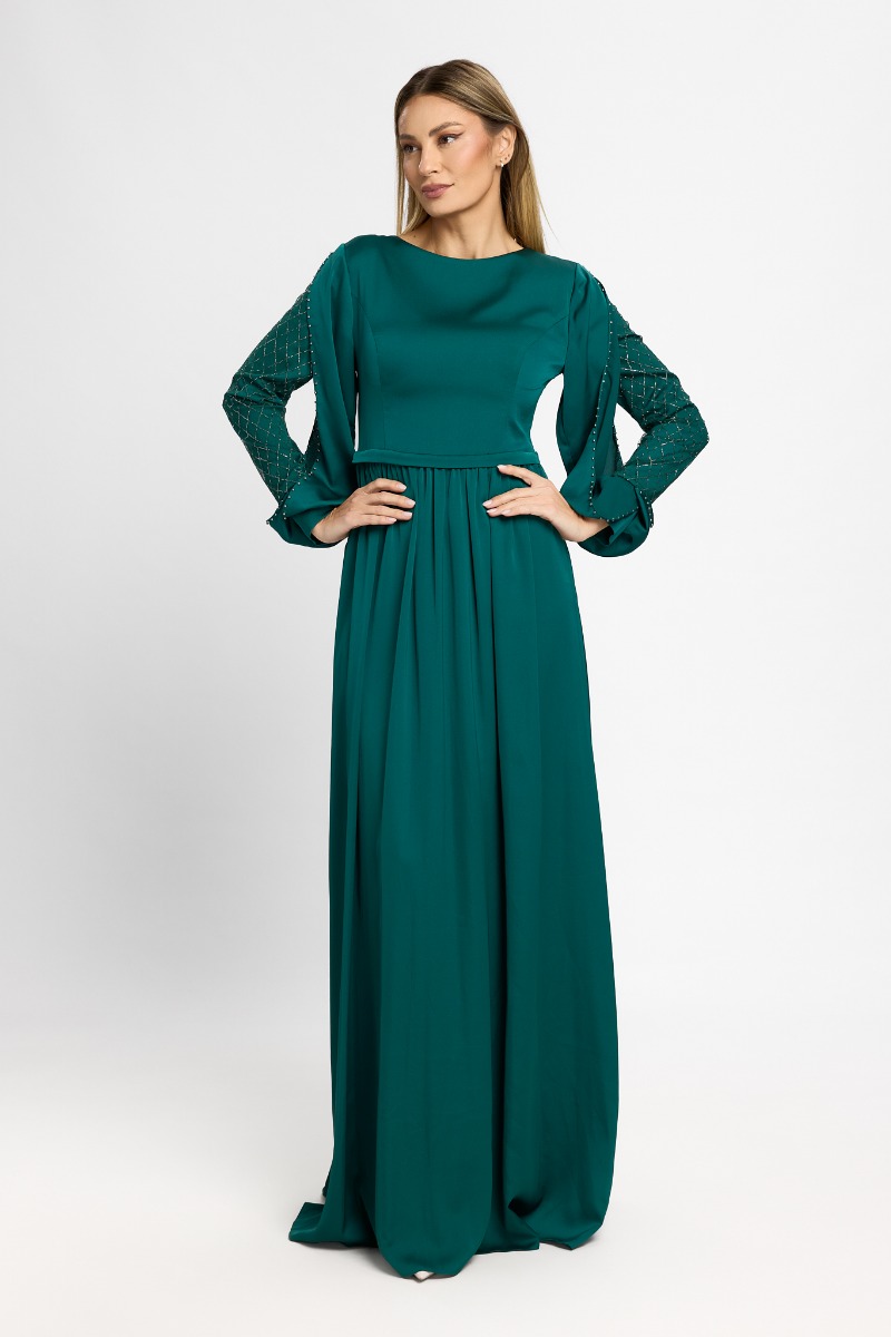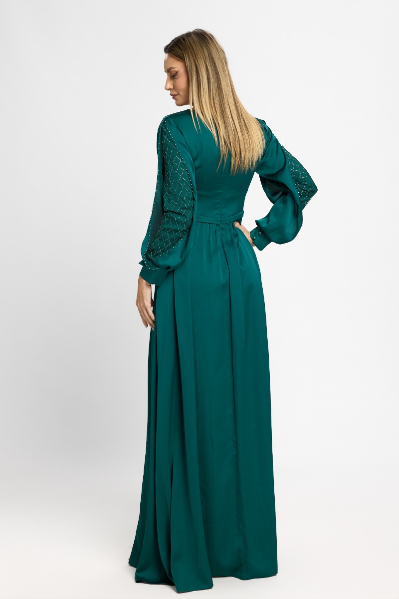 Această rochie lungă verde din satin este expresia perfectă a rafinamentului și a feminității, creată pentru apariții spectaculoase la evenimente speciale. Croiala în clos oferă volum delicat și mișcare fluidă, conturând o siluetă grațioasă și elegantă la fiecare pas.
