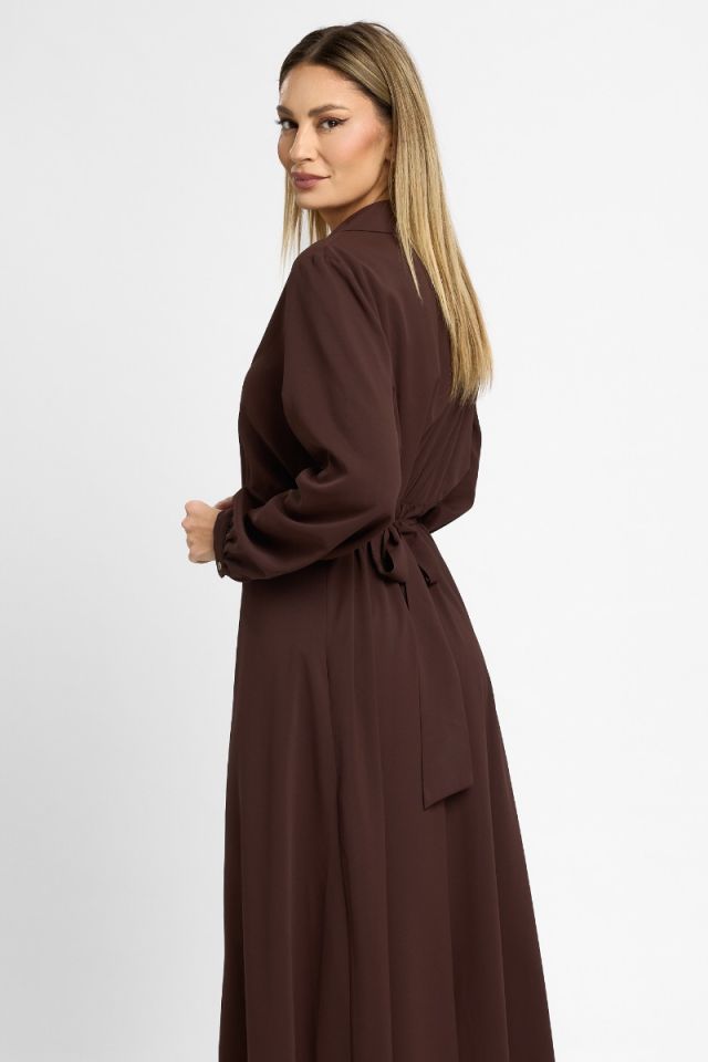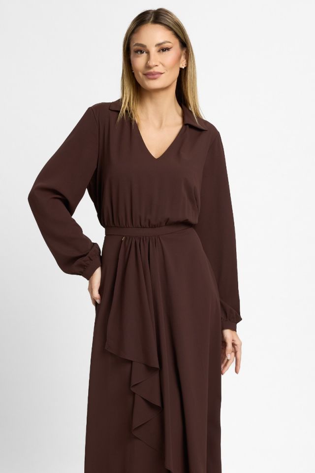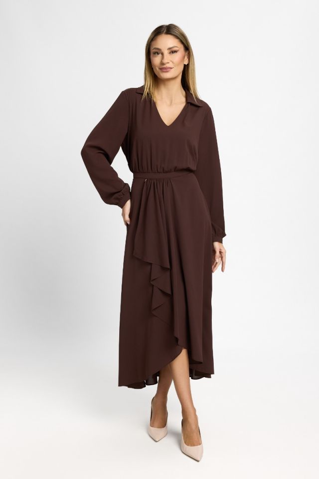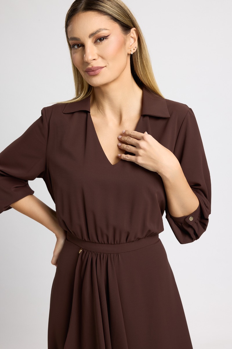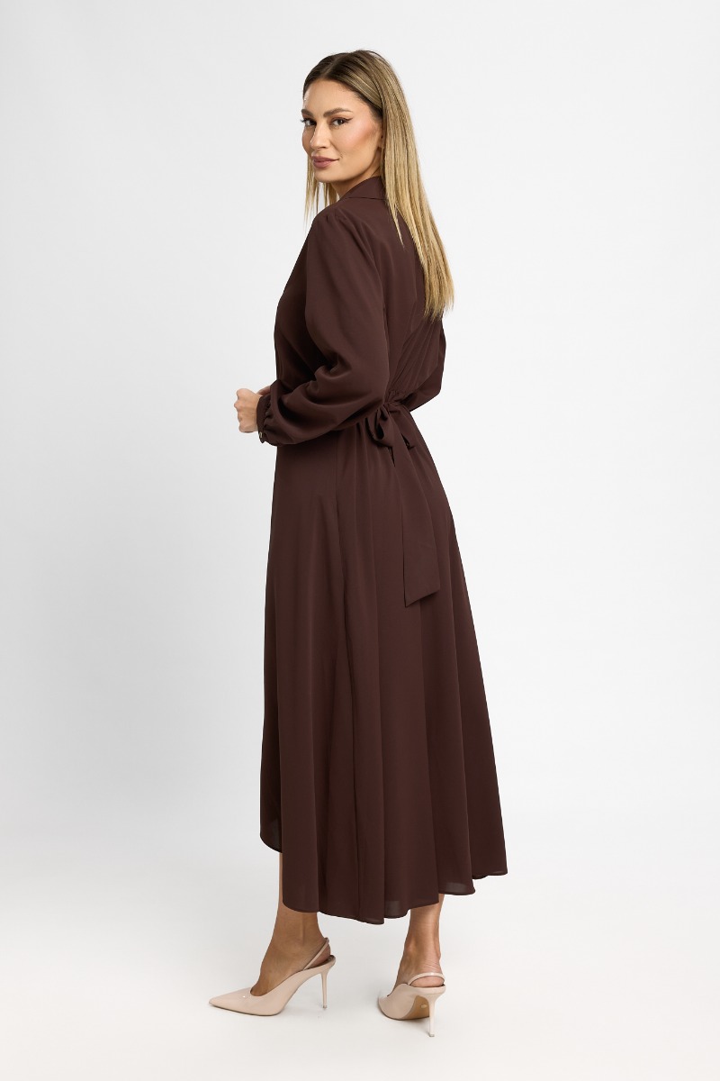 Delicată și sofisticată, această rochie midi din voal maro este creată pentru a pune în valoare feminitatea prin linii fluide și detalii moderne. Materialul vaporos oferă lejeritate și un efect diafan la fiecare pas, transformând fiecare apariție într-una rafinată și naturală.