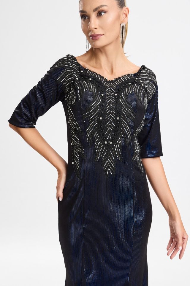 Rochie de ocazie premium din catifea cu strass-uri in partea superioara Moon Bleumarin
