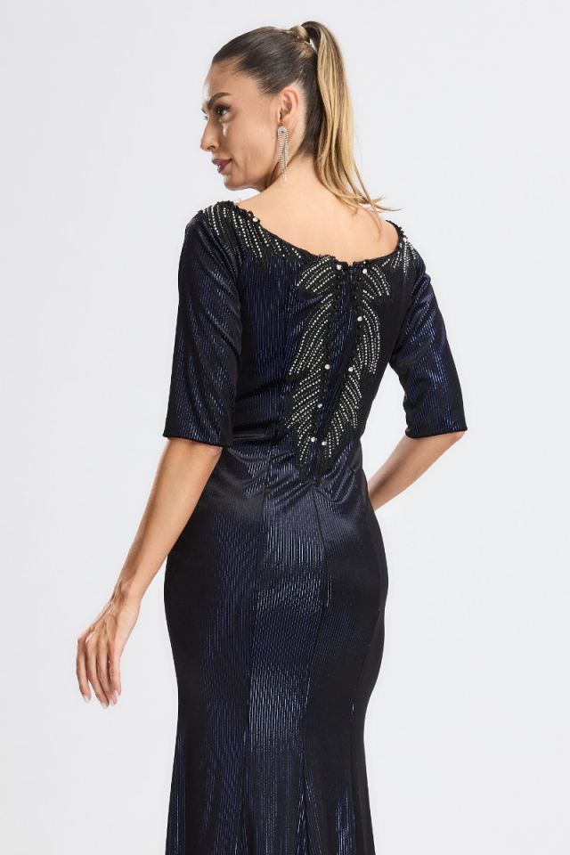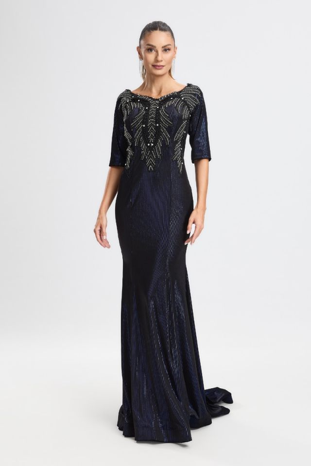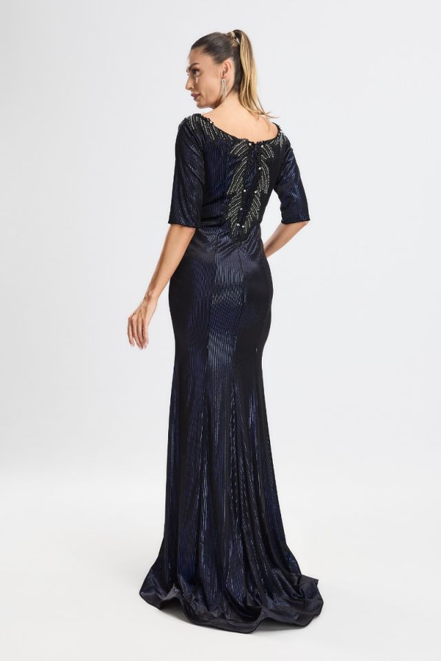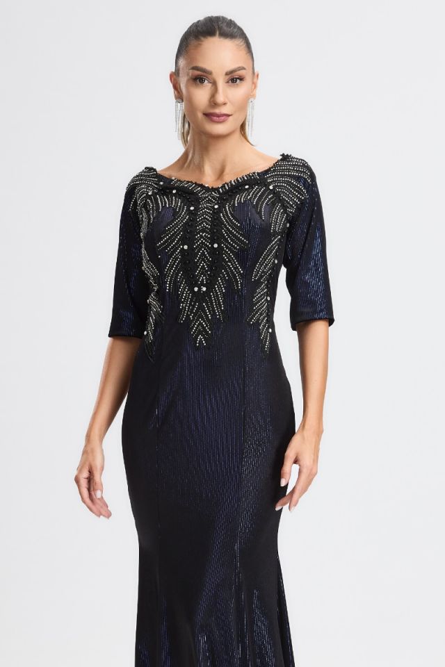 Un design sofisticat care îmbină eleganța catifelei fine cu strălucirea discretă a strass-urilor din zona bustului. Croiul tip sirenă subliniază grațios formele și oferă o siluetă alungită și rafinată, perfectă pentru evenimente de gală, petreceri sau seri în care vrei să impresionezi prin stil și feminitate.
