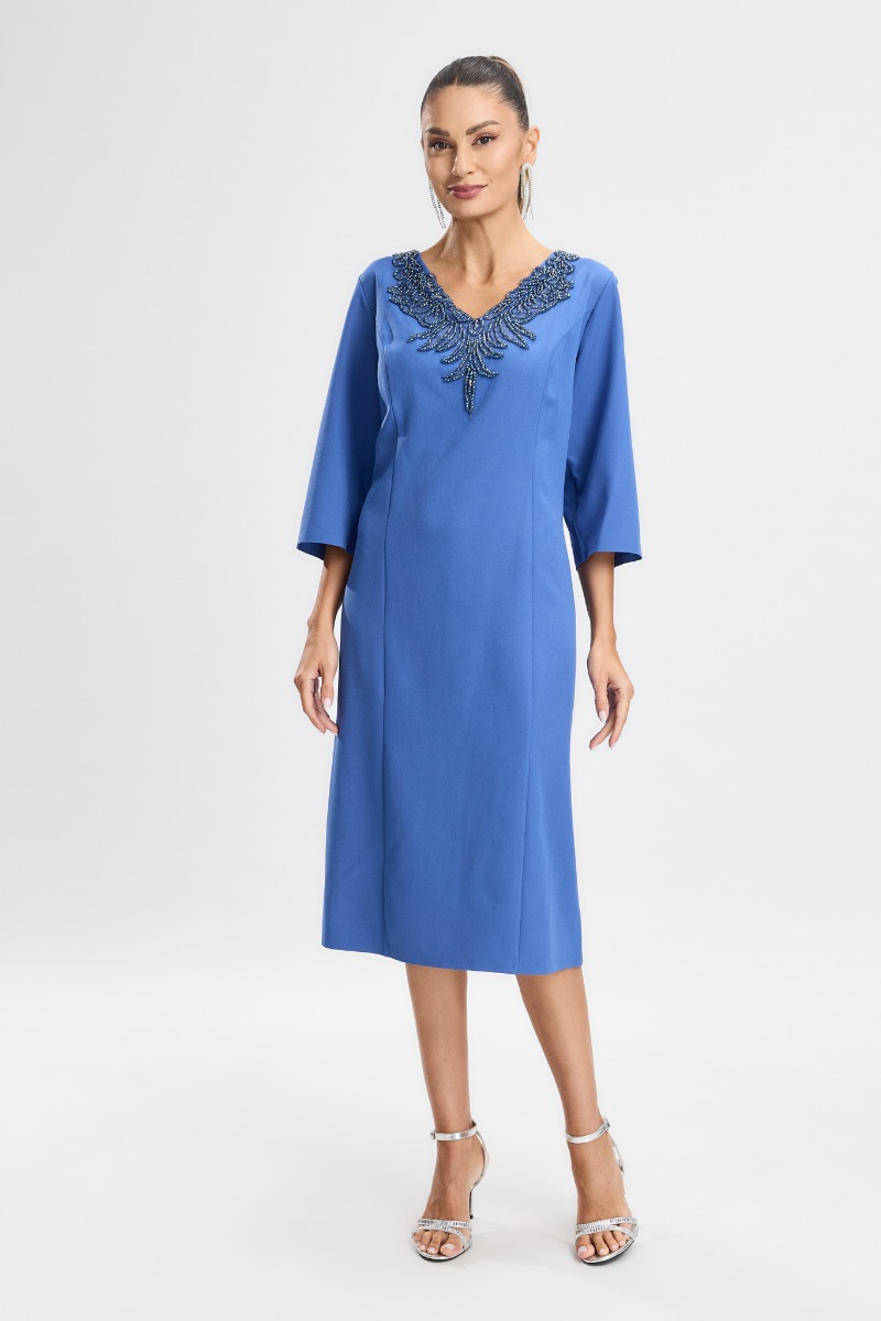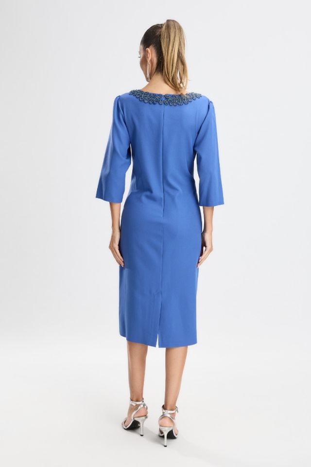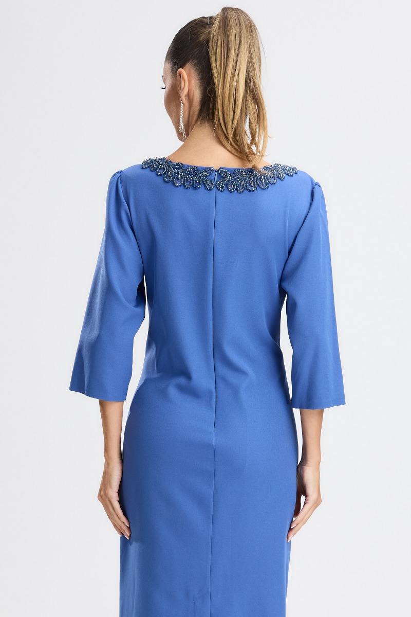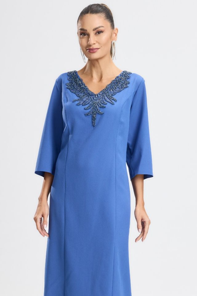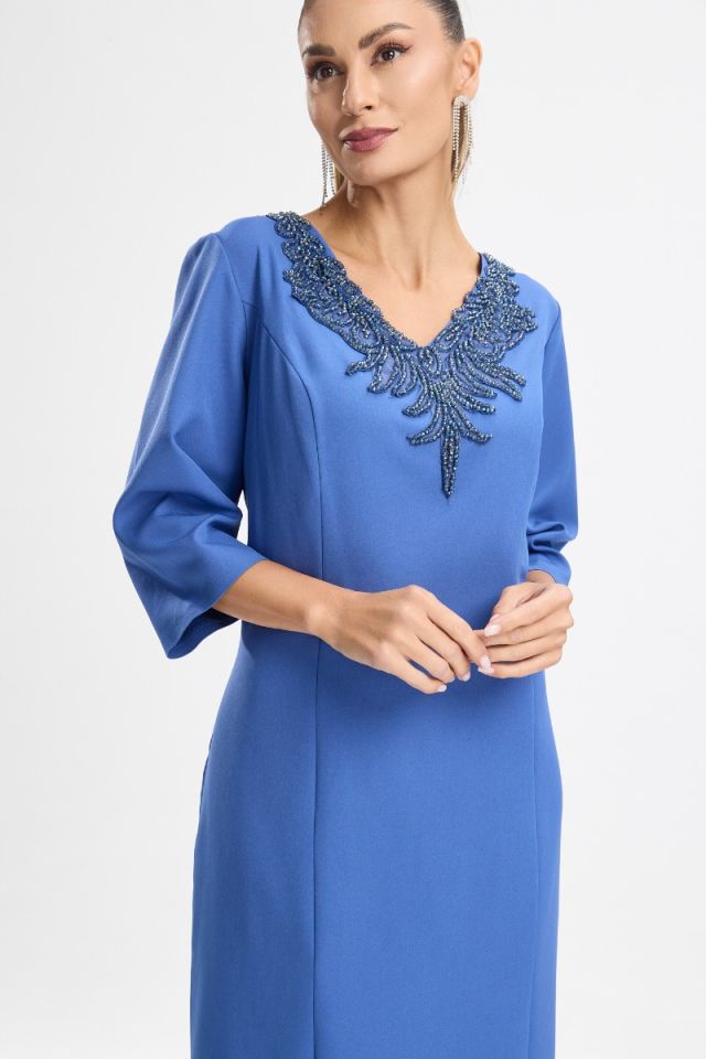 Rochia de ocazie albastră midi impresionează prin rafinament și strălucire. Accesorizată cu strass-uri la decolteu, adaugă o notă glam perfect echilibrată. Croiala elegantă pune în valoare silueta, făcând-o alegerea ideală pentru evenimente speciale și seri de neuitat.