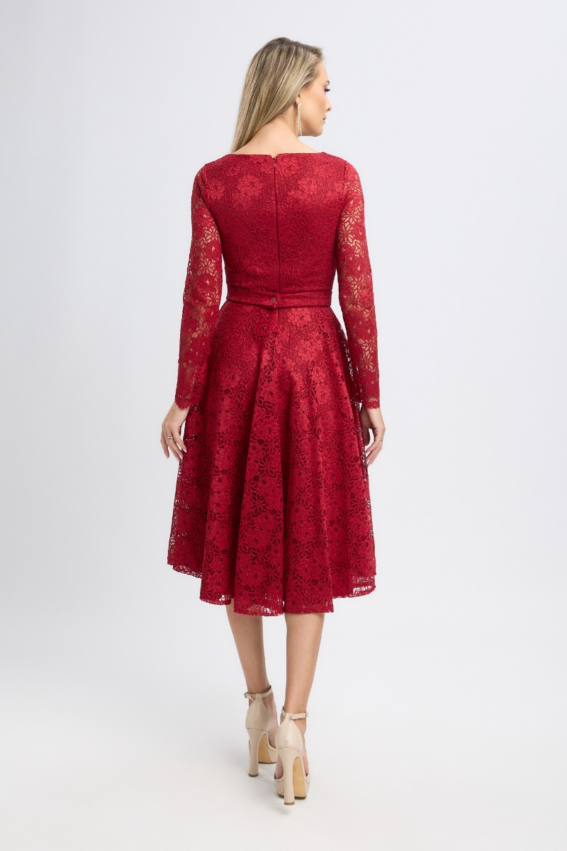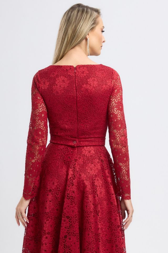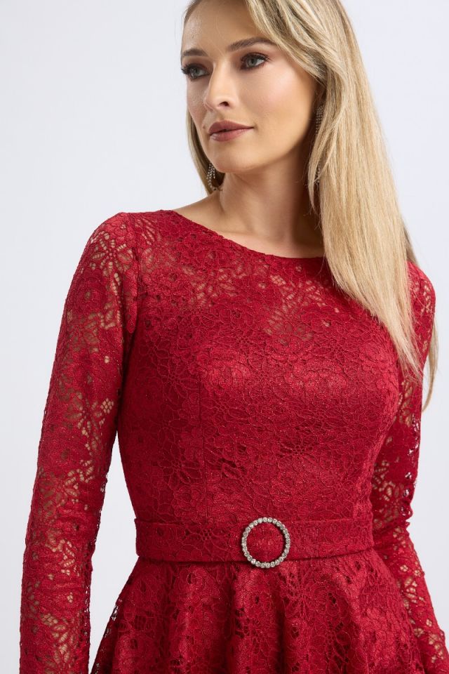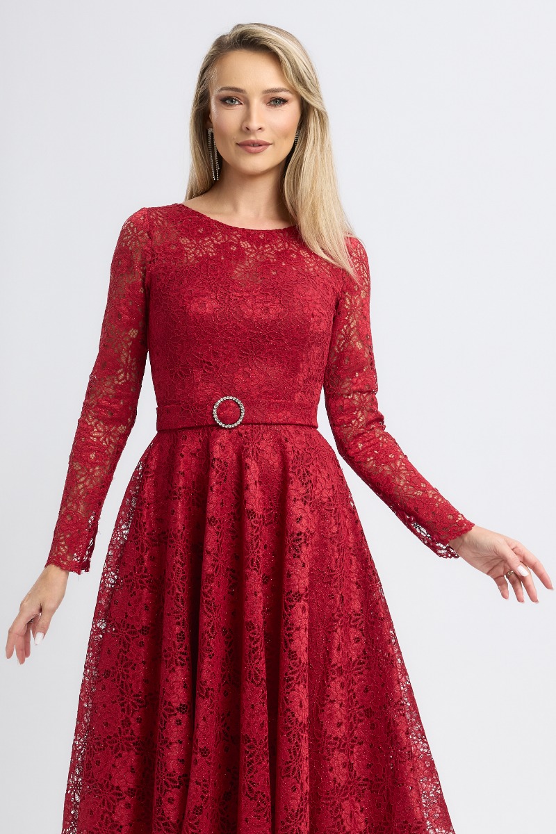 Răvășitoare prin rafinament și feminitate, această rochie midi de ocazie bordo din dantelă cu glitter este alegerea perfectă pentru apariții memorabile. Creată pentru a sublinia grația și eleganța, rochia îmbină textura delicată a dantelei cu glitterul subtil, oferind un efect spectaculos.