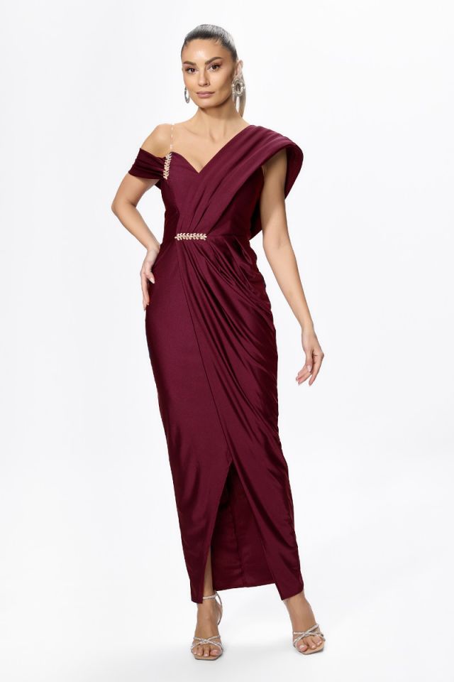 Rochie de ocazie bordo cu model petrecut si strass-uri, reprezinta tinuta perfecta pentru evenimentele cu stil din acest sezon. Realizata dintr-un material elegant si un design delicat, confera tinutei tale un rafinament aparte.