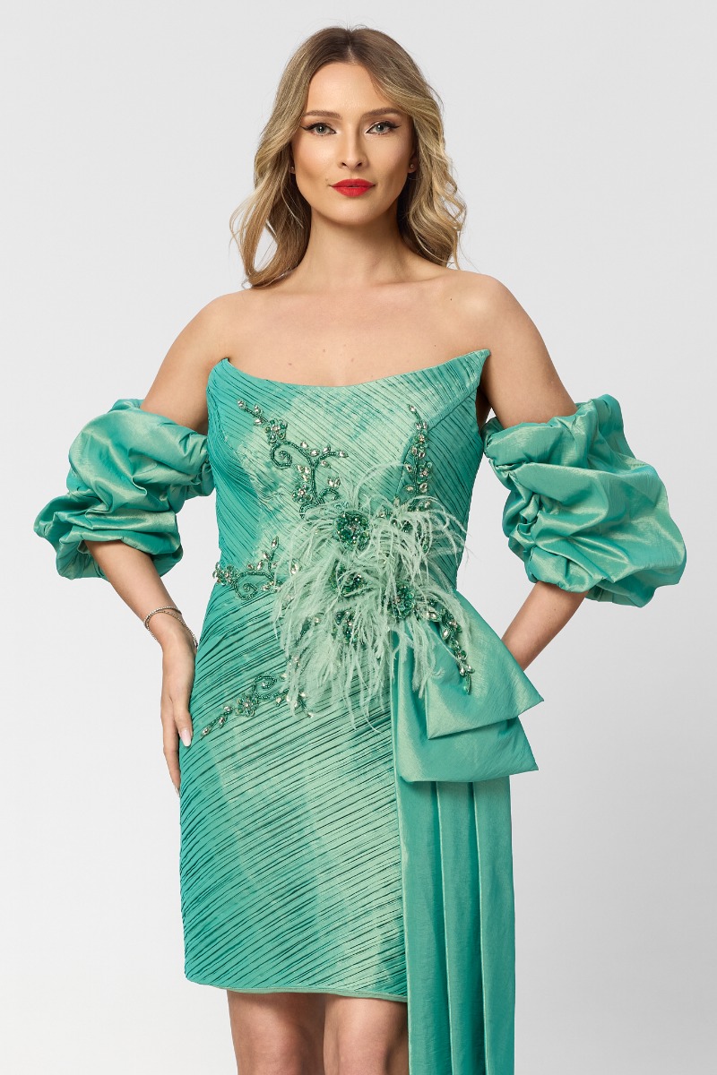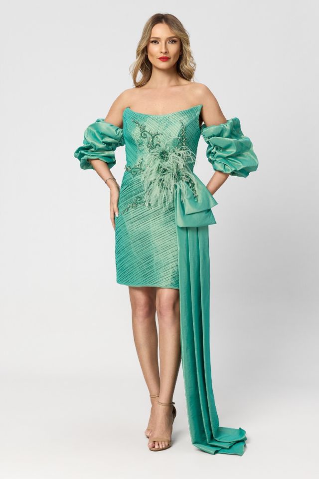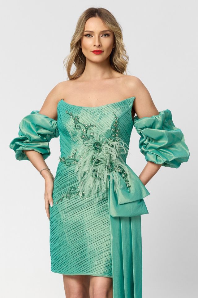 O rochie scurtă premium din tafta verde-mint, cu trenă laterală, este alegerea ideală pentru o apariție spectaculoasă și plină de rafinament. Materialul din tafta ofera un aspect elegant și ușor lucios, specific pieselor din colecțiile de lux.